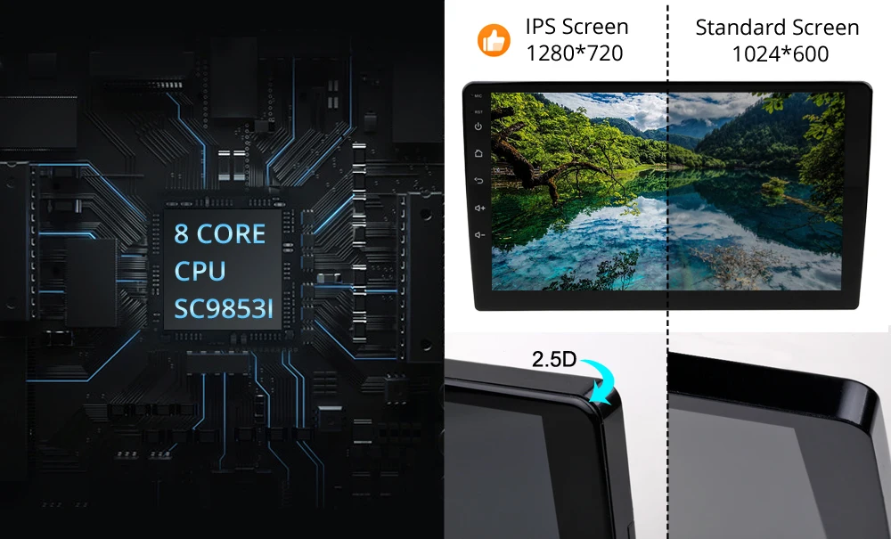 1. 8 core CPU SC9853i 8*1.8 GHz, 2.5D IPS high brighness grade A screen 1280*720.