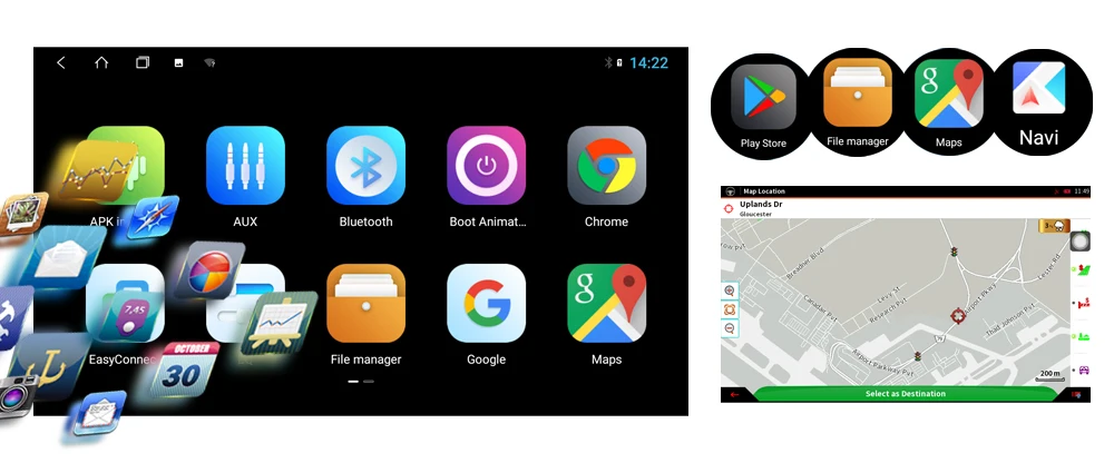 1. google Play store (загрузите миллион приложений из google play store и установите), встроенный gps (вы можете использовать онлайн-карту google или другое популярное онлайн/автономное навигационное приложение)
