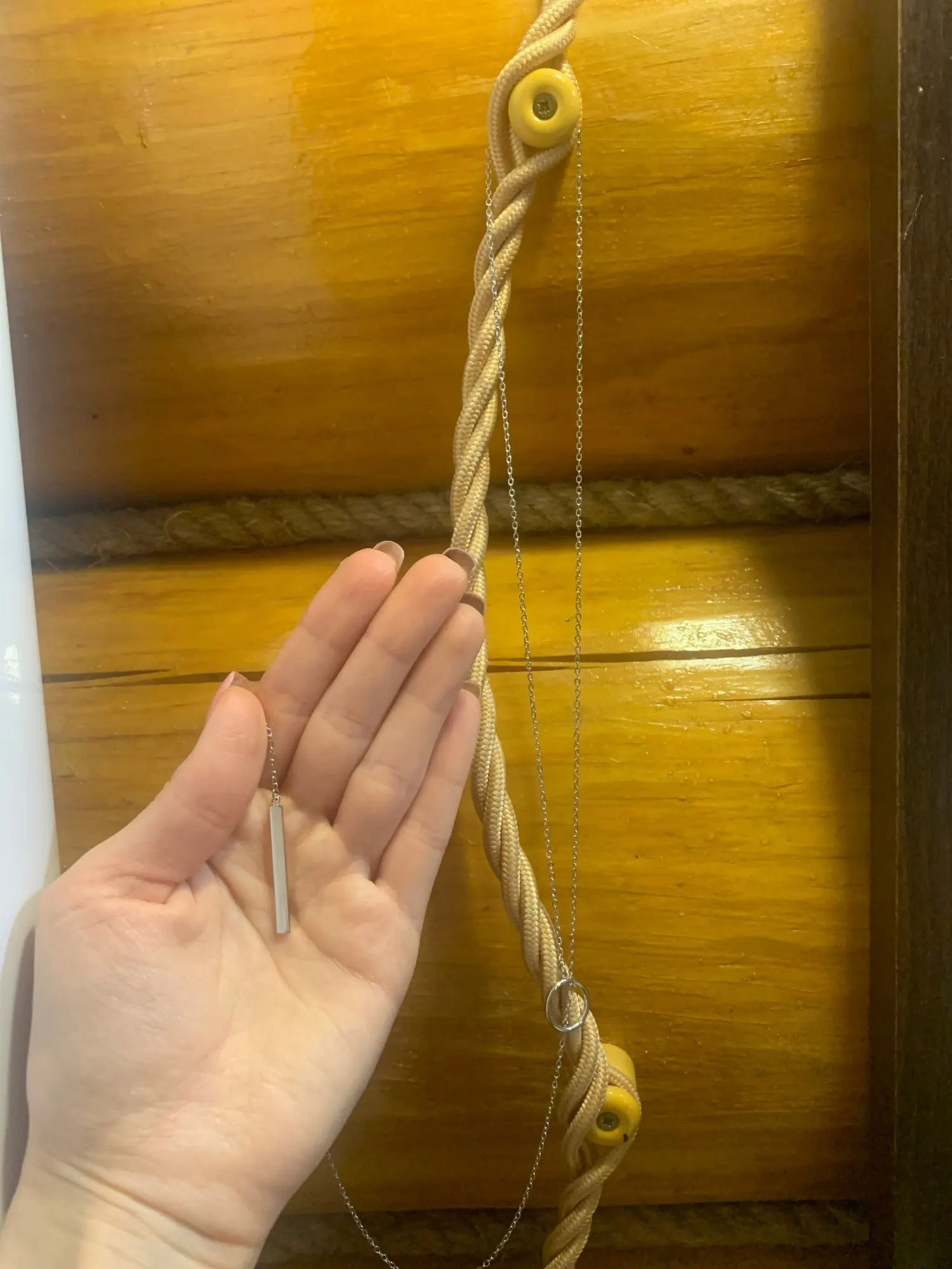 Очень-очень классный кулон. На мою шею идеально два обхвата с идеальной оставшейся длиной. только в маленьком кусочке вместо звеньев проволока почему то, но она сильно не выделяется, не зацепила бы волосы и не заметила.