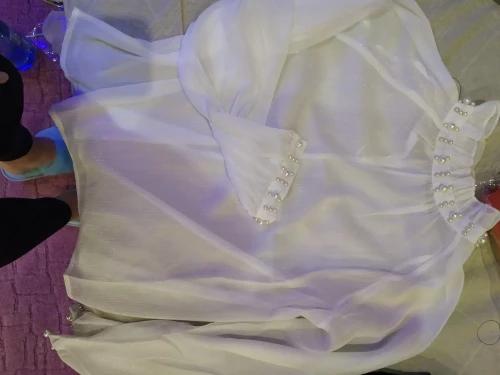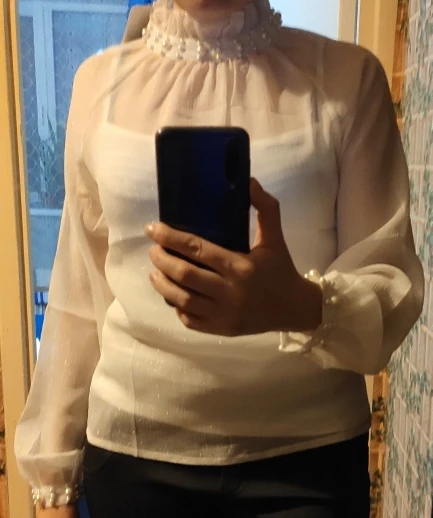 Блузка красивая, нежная, полупрозрачная с вышивкой из искусственного жемчуга, идёт в комплекте с нижней майкой из трикотажа. Ткань приятная на ощупь, слегка блестящая и чуть-чуть гофрированная, поэтому смотрится очень празднично. Скрадывает большую грудь. Единственный недостаток - нижняя майка может подниматься выше талии, оголяя под блузкой пупок.