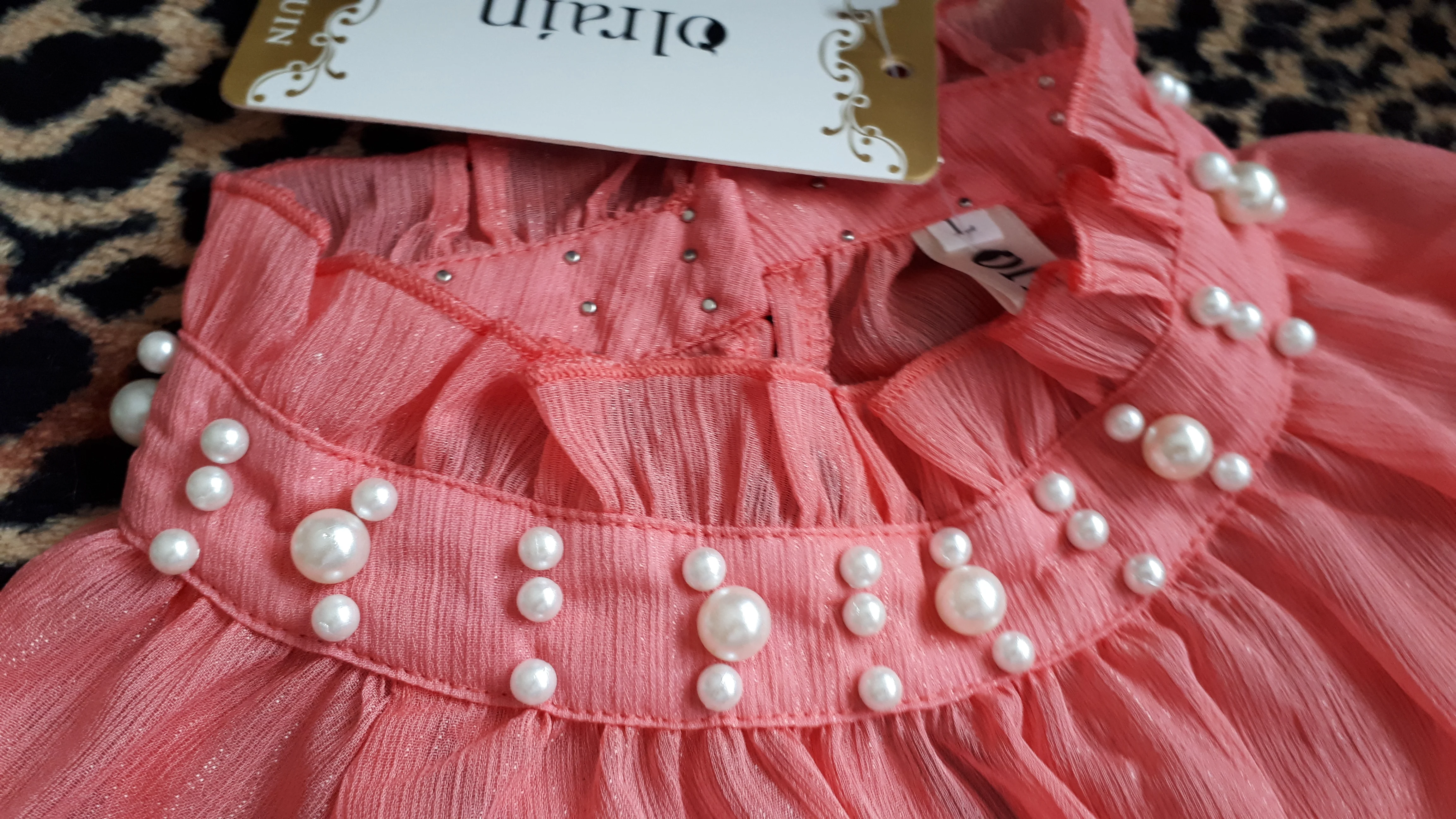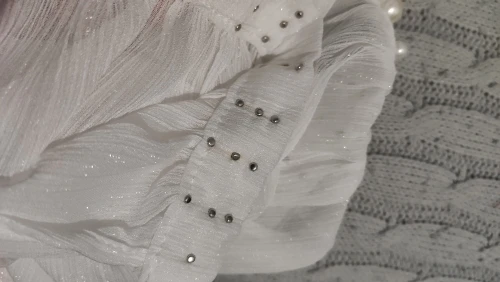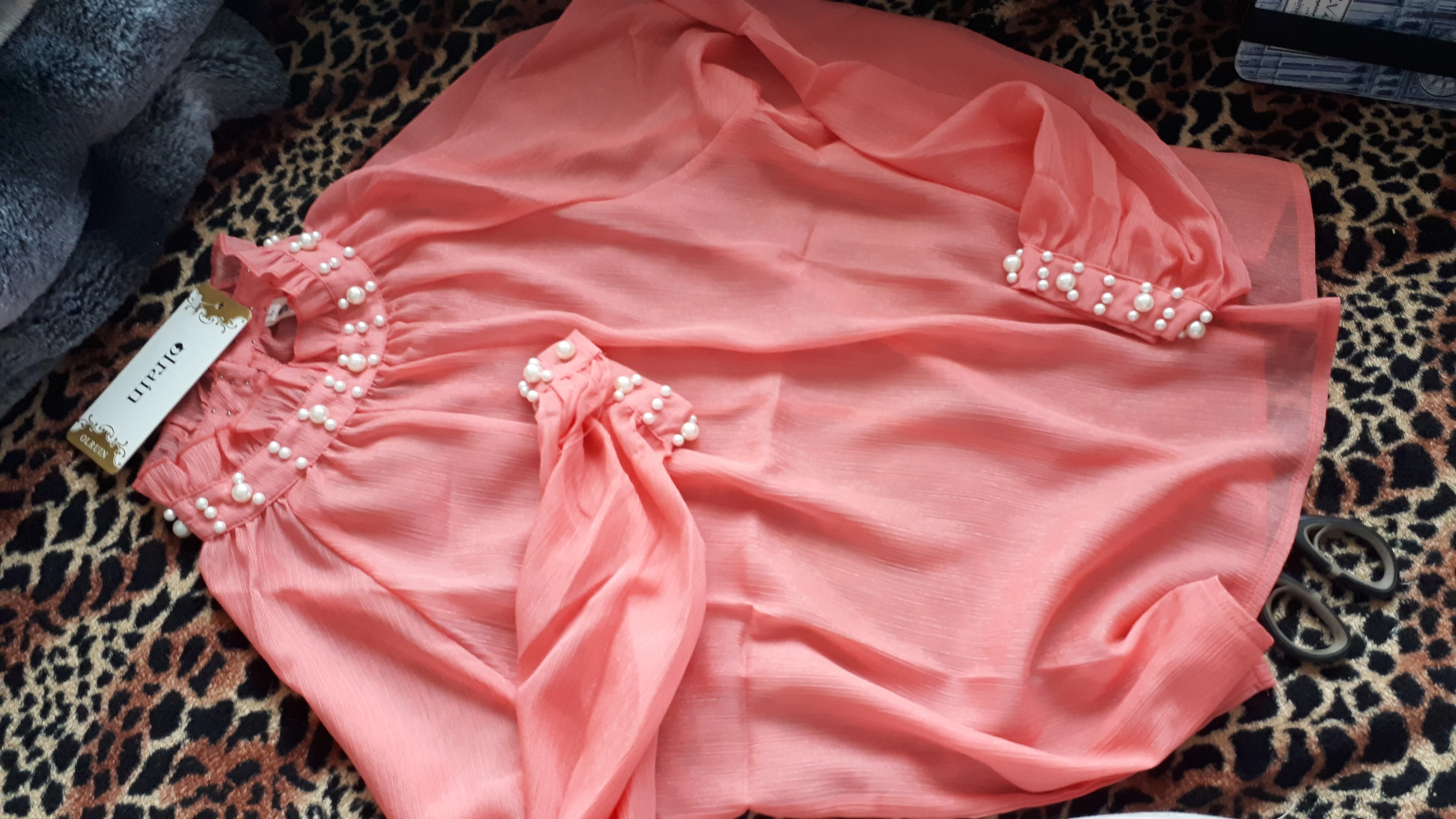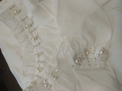 размер М подошел на 44. рукава не такие пышные, как на фото, наверное, нужно было брать на размер побольше. когда покупала, думала, что жемчужины пришиты, но оказалось, что они на металлических заклепках, и уже есть следы ржавчины вокруг заклепок. после стирки будет еще хуже, наверное