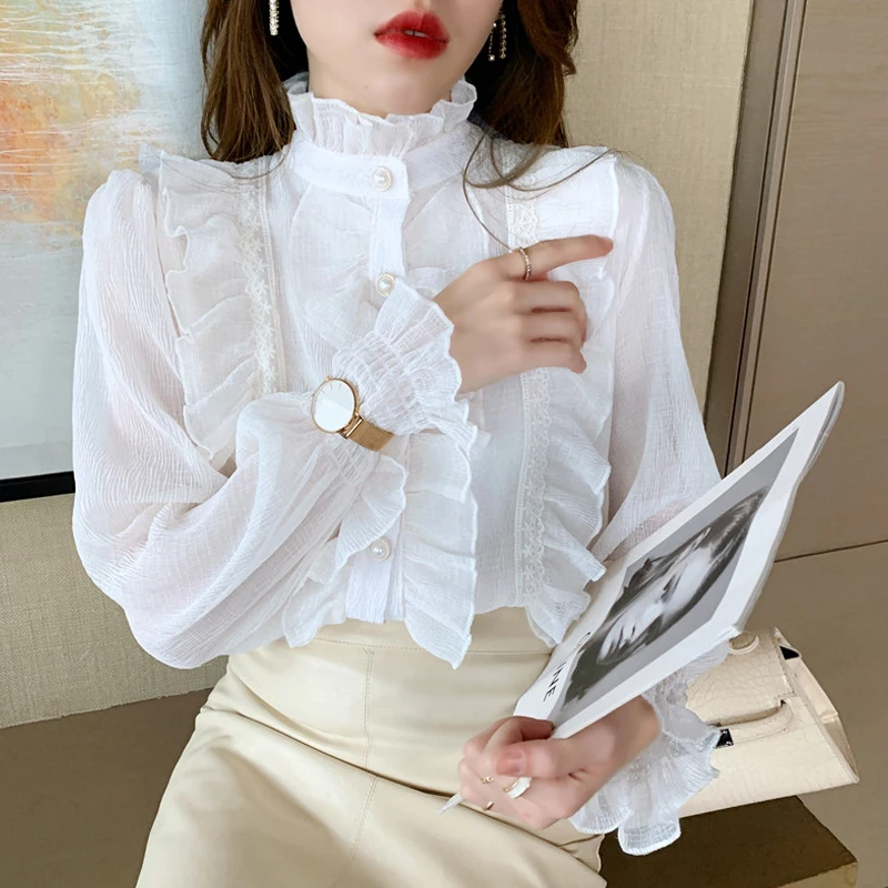 Весенняя новая шифоновая блузка с рукавом длинным Женские топы и блузки кружевная Нижняя Женская одежда с бисером женские рубашки одежда 1807 50