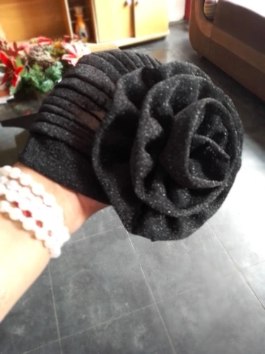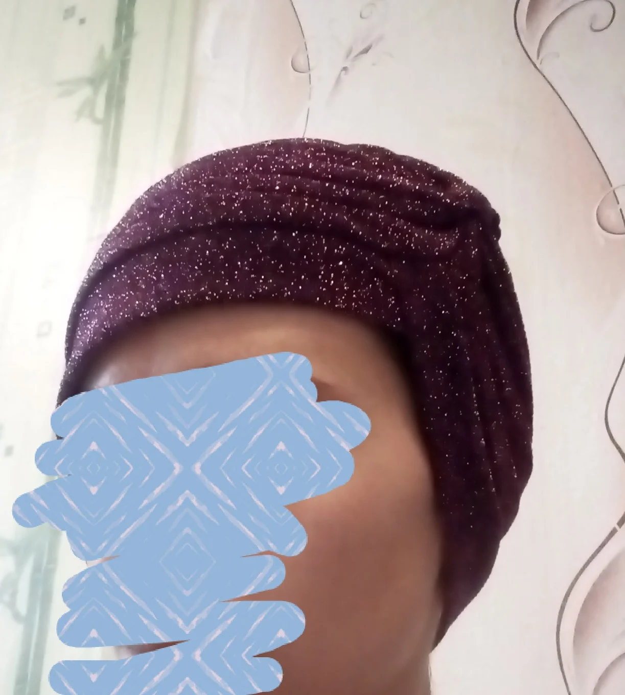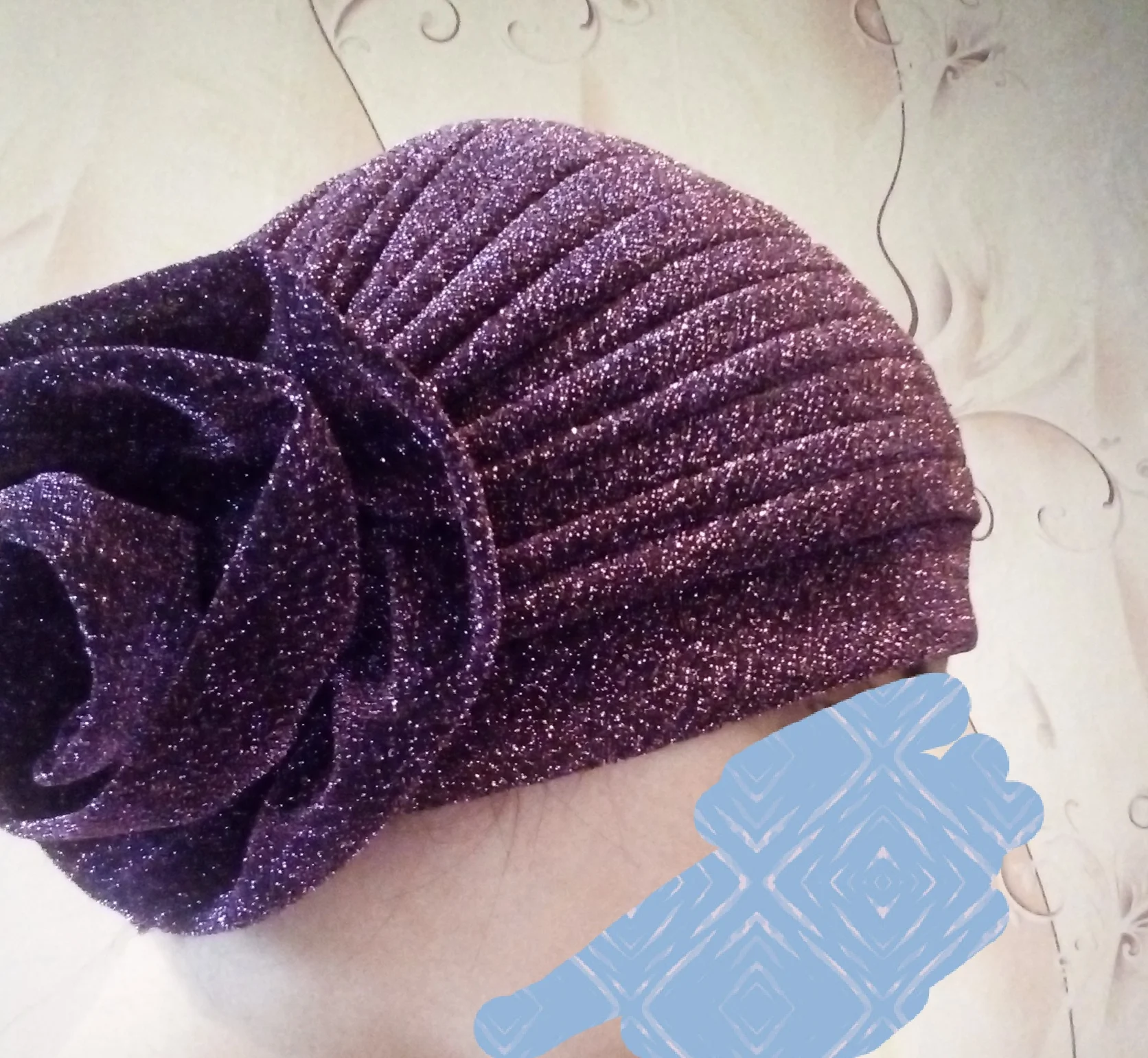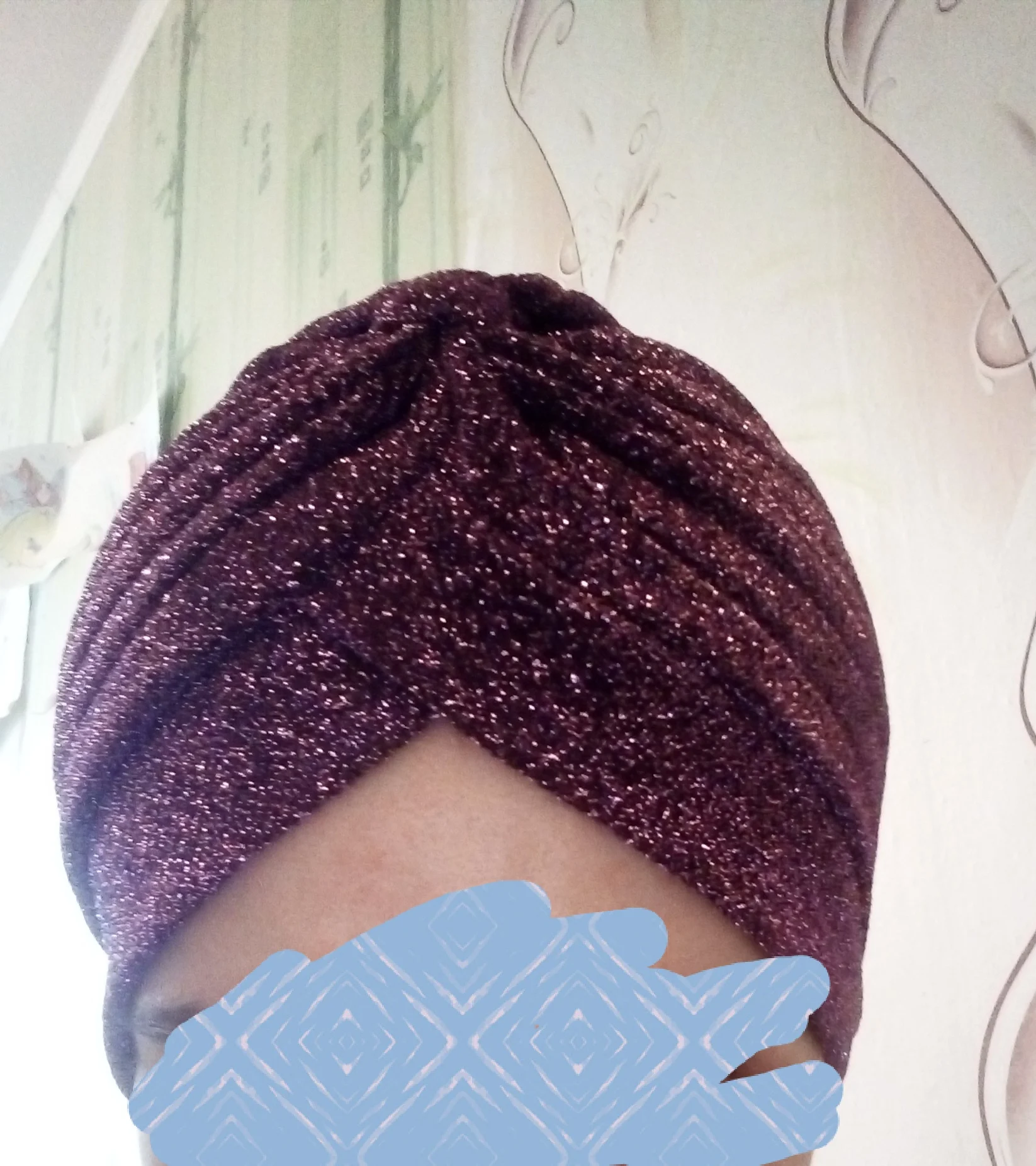Блестящая, красивая ткань, но вот я не заметила, что край шапочки на лбу не ровный, а треугольным вырезом, мне такое не идёт А если, надеть так, как на фото, то с одной стороны и будет, как на фото, а вот с другой-не пойми что.