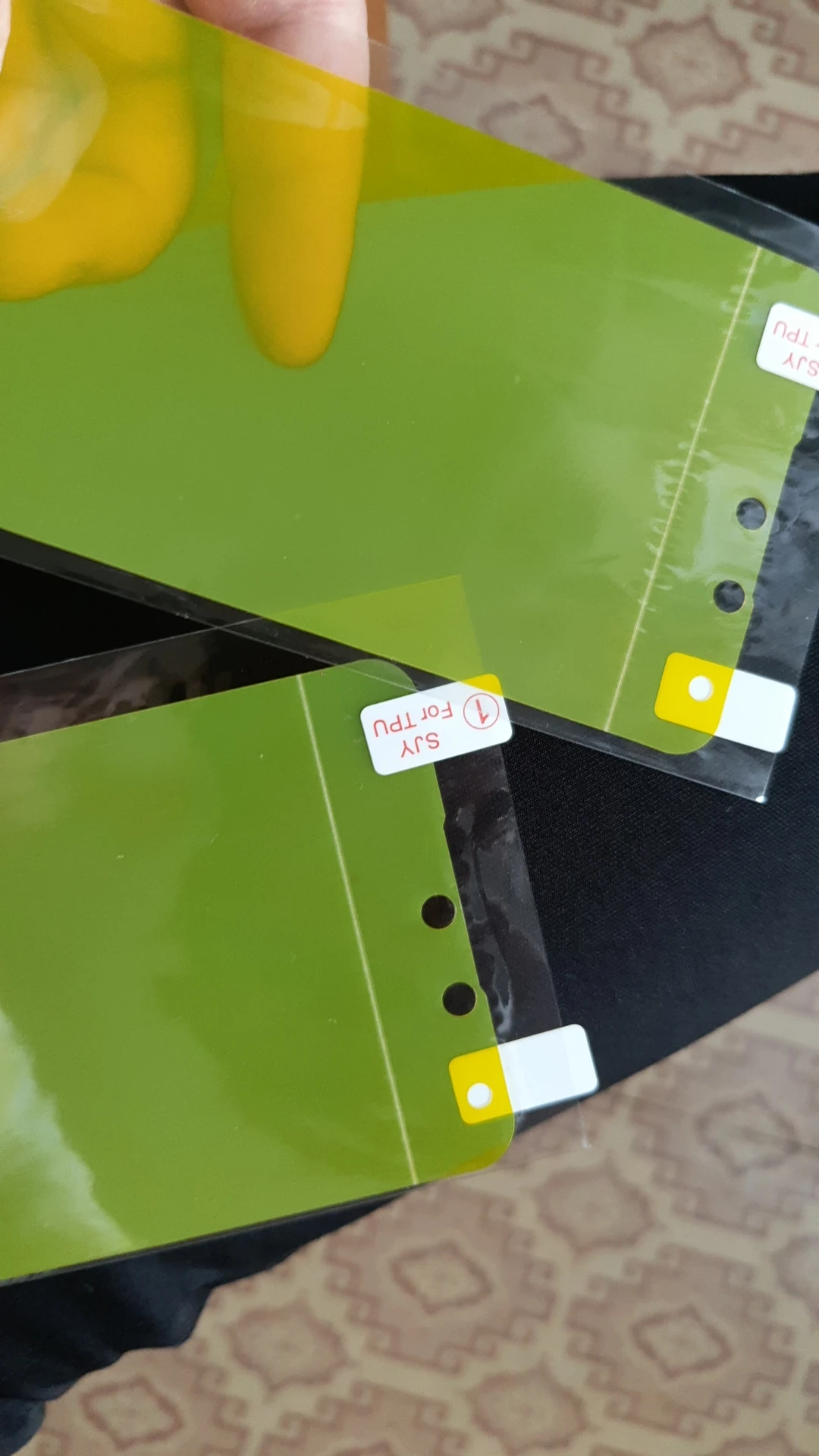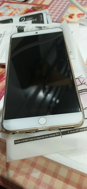 Сама плёнка хорошего качества, но у меня края задирались чехлом, поэтому пришлось подрезать по периметру, лучше конечно это было сделать сразу. И ещё одна проблема - после наклейки пленки на ней осталась полоска в том месте, где соединяются две внутренние части, которые надо отклеить изнутри перед нанесением на экран. Это конечно не большая проблема, но всё таки раздражает