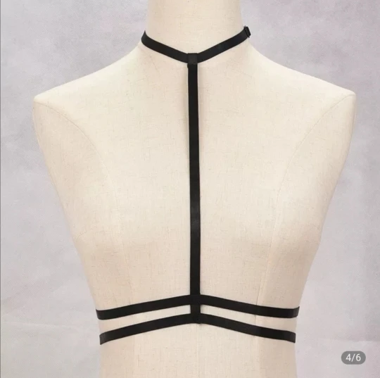 Доставка примерно за месяц. Картинке соответствует, мягкий материал, кожу не режет. Регулируется объем на шее и под грудью. Нижние "полосы" чуть ниже груди, на ребрах - хотелось бы пониже, но и так хорошо