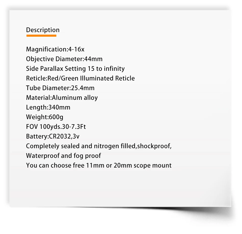 Тактический Оптический прицел AOE 4-16x44, зеленые и красные осветительные прицелы для охоты, искусственный страйкбольный пневматический пистолет