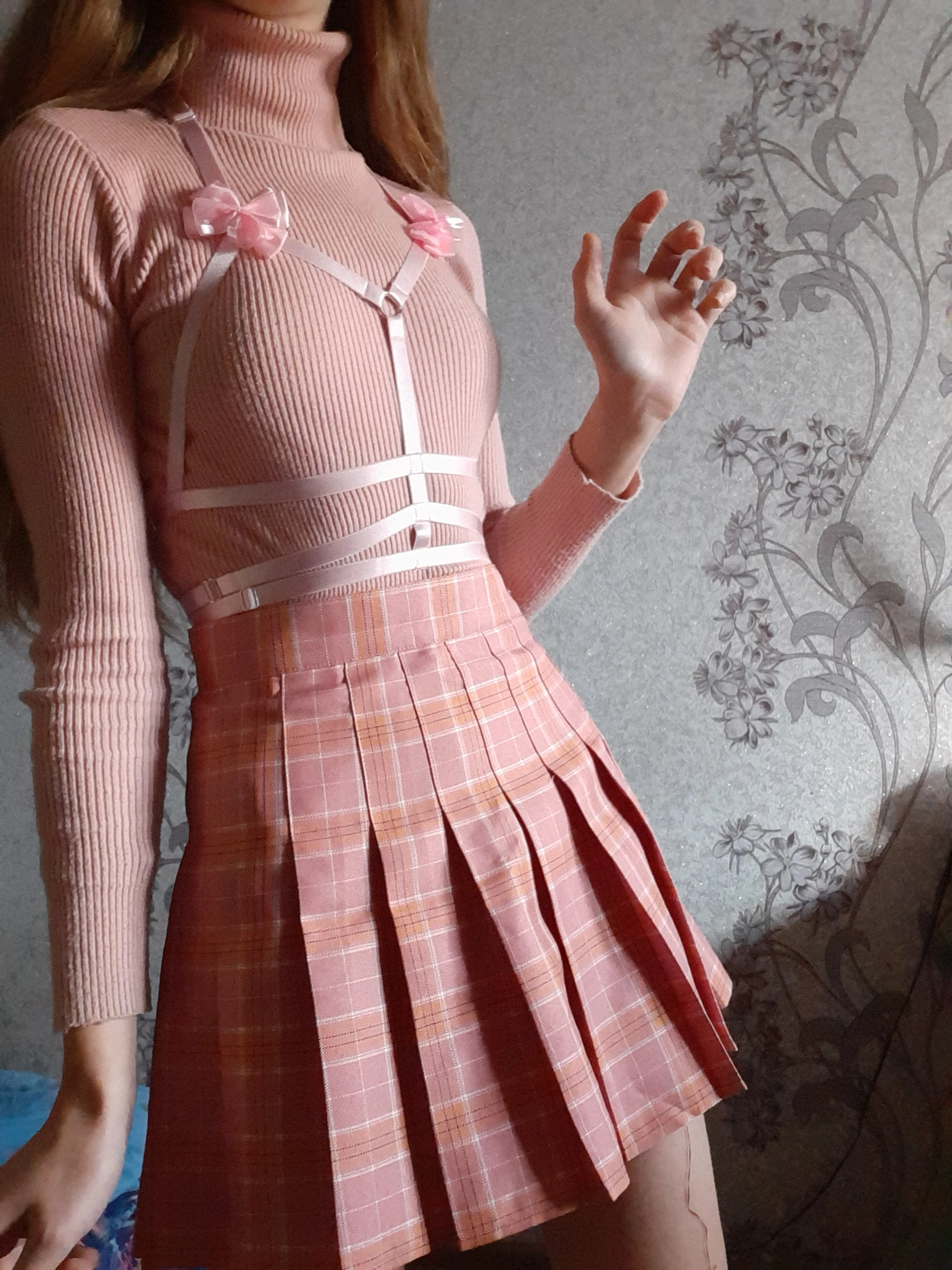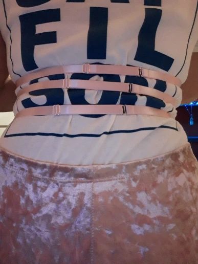 Я заказал этот ремень 26 августа и получил его 19 сентября. Я 150 фунтов, ношу большие рубашки, и у меня 36DD грудь. Он ощущается как ремешок для бюстгальтера, но более эластичный. Это детский розовый цвет, но банты немного ярче, чем ремешки. Он остается на месте и имеет регулируемые ремни, поэтому подойдет любой размер. (Я планирую носить его с белой водолазкой и розовой юбкой, так извините за странный выбор одежды на фотографиях.)
