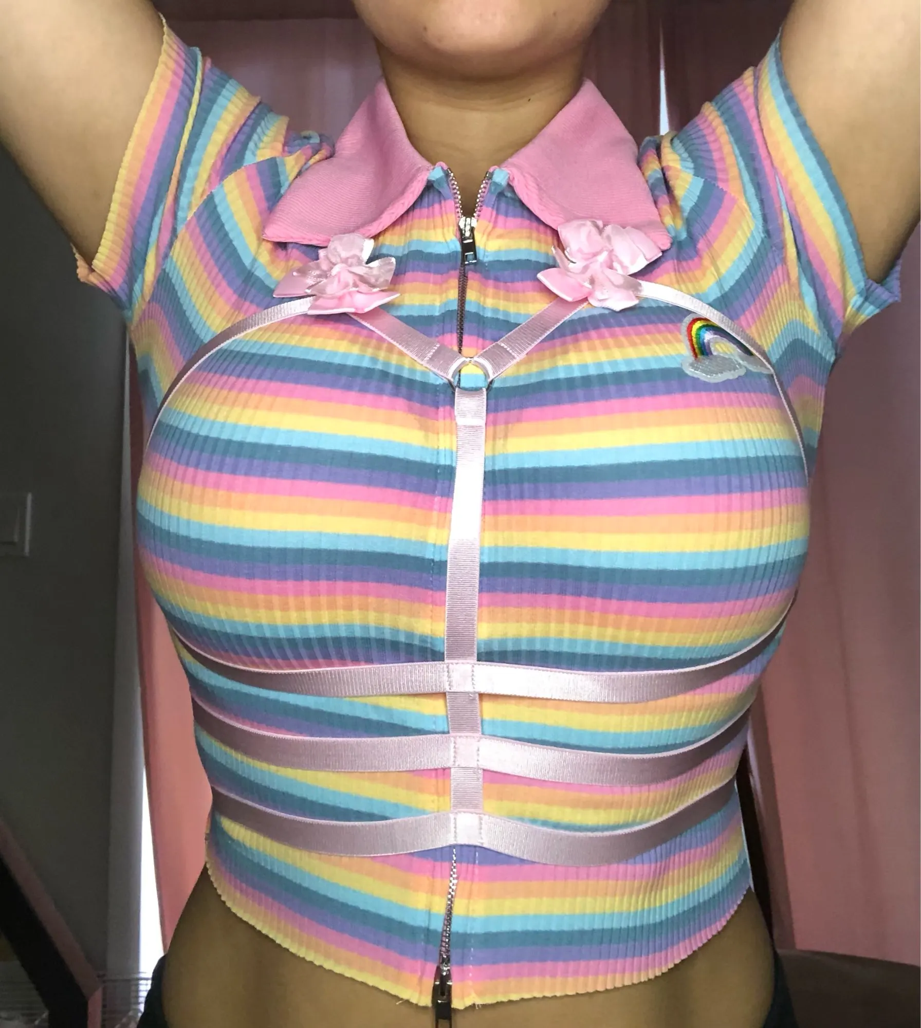 Я loooooove это выглядит так же, как на картинке (поводок не является частью заказа, извините за плохое качество фото btw). Прибыло в течение 2 недель (Турция). Я ношу бюстгальтер размера 85d, я думаю, что это как 32e в Америке? Что я хочу сказать, так это то, что эти ремни очень просты, когда дело доходит до размера. Если у вас есть швейная машина, вы можете полностью сшить что-то похожее на это самостоятельно, потому что это просто сделано из полос lol. Но если вы хотите купить его, это довольно мило, я хотел бы вернуть его.