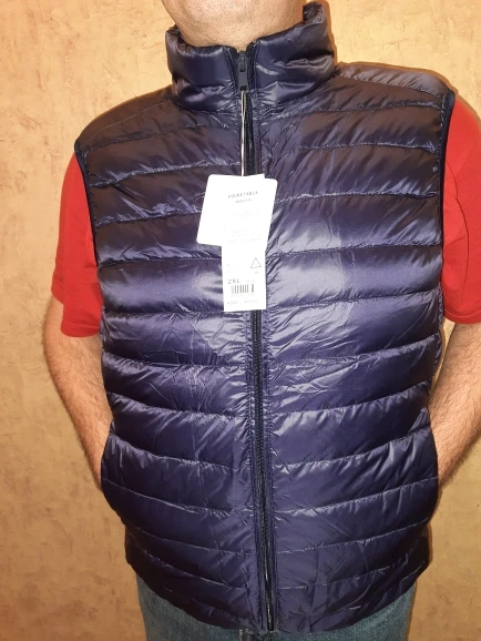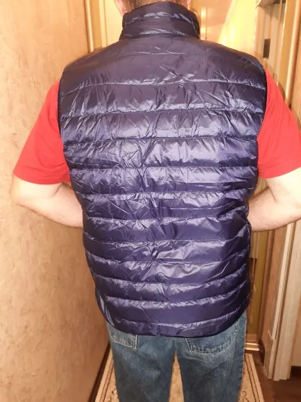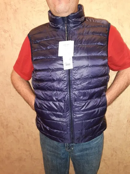 Супруг рад! На его 46-48 взяла размер L. Наполнитель-настоящий пух, местами есть торчащие пушинки. Желетка тонковата