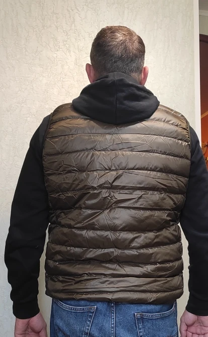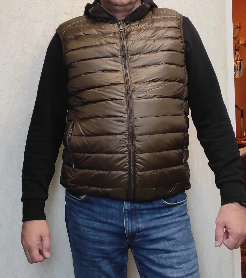 Жилетик приехал быстро, в обещанный срок. По размеру подошел отлично на рост 182 вес 93. Понравились большие карманы. Швы ровные, пух не торчит. Прилагается мешочек, в котором можно этот жилет хранить. Цвет, как мне показалось, больше не кофейный коричневый, а с болотным оттенком, но супругу понравился. Все хорошо, спасибо!