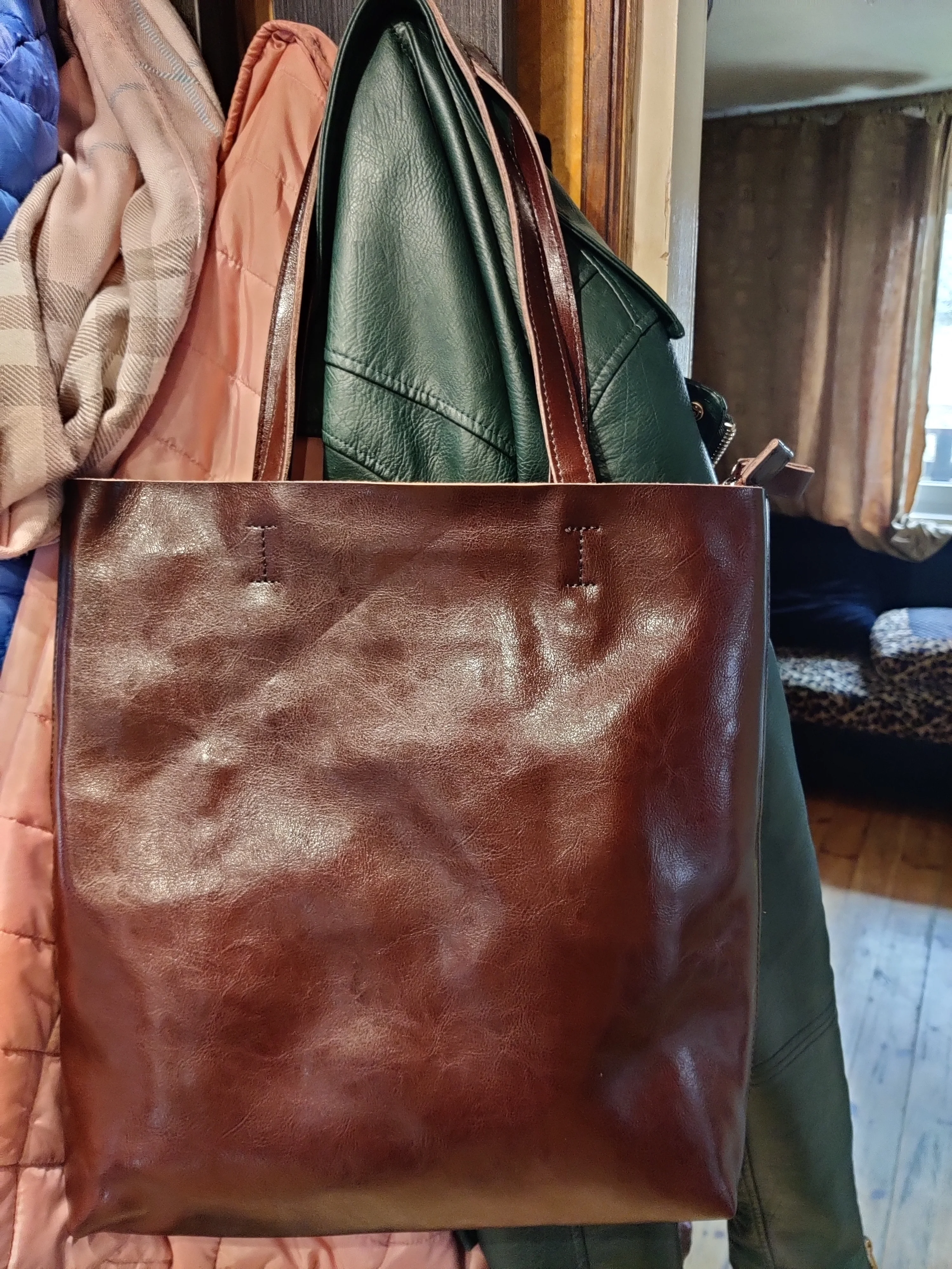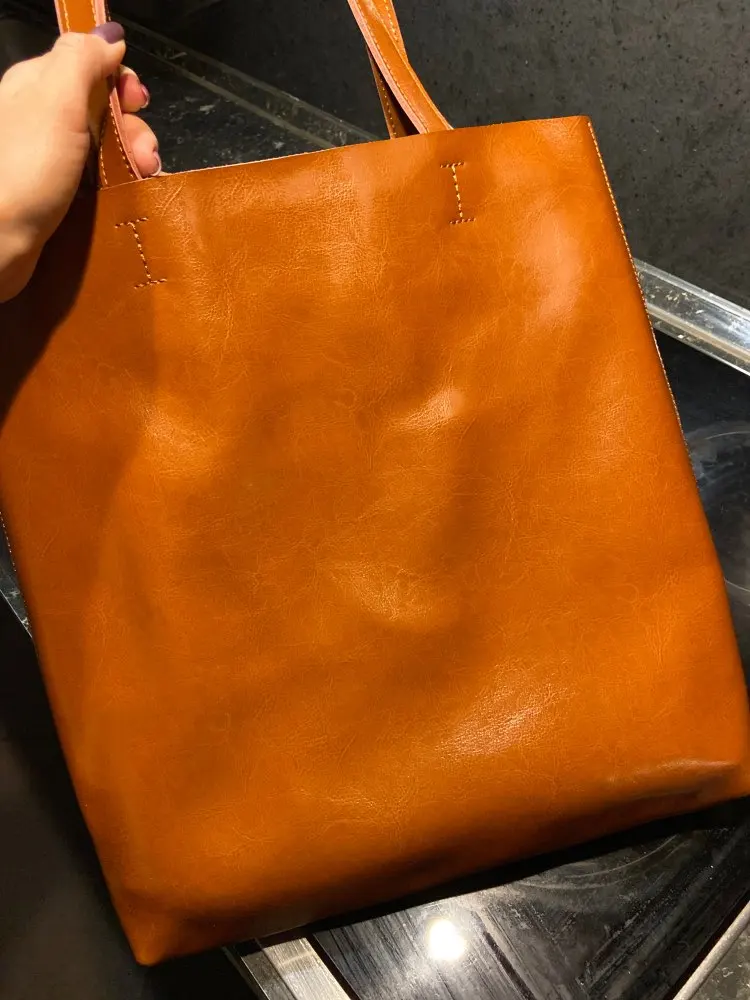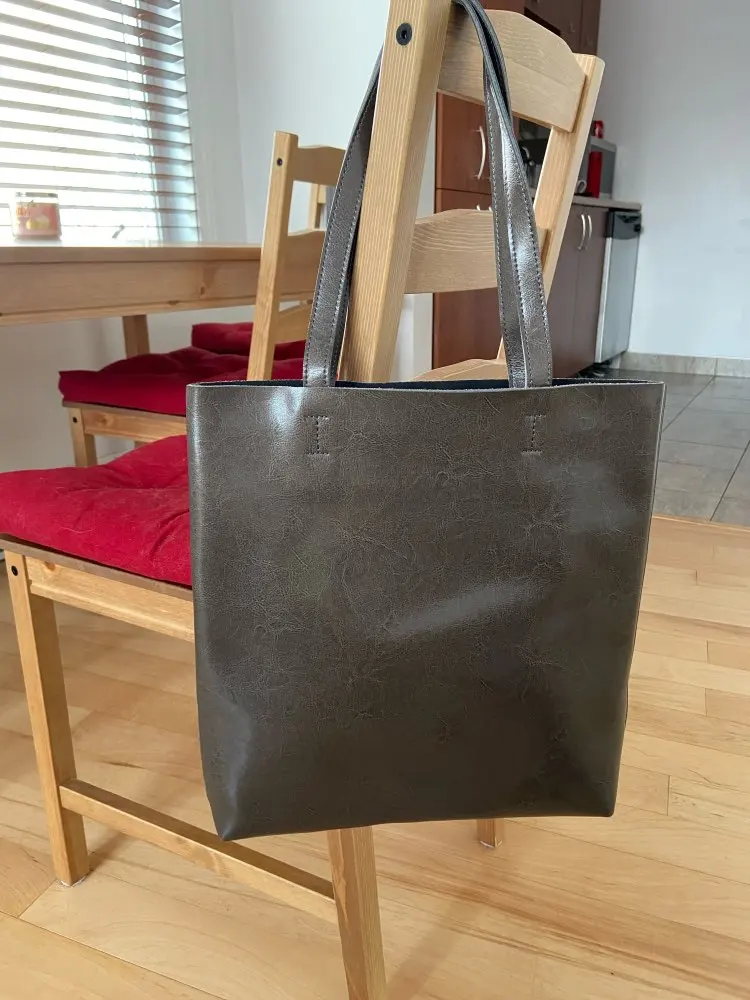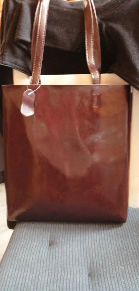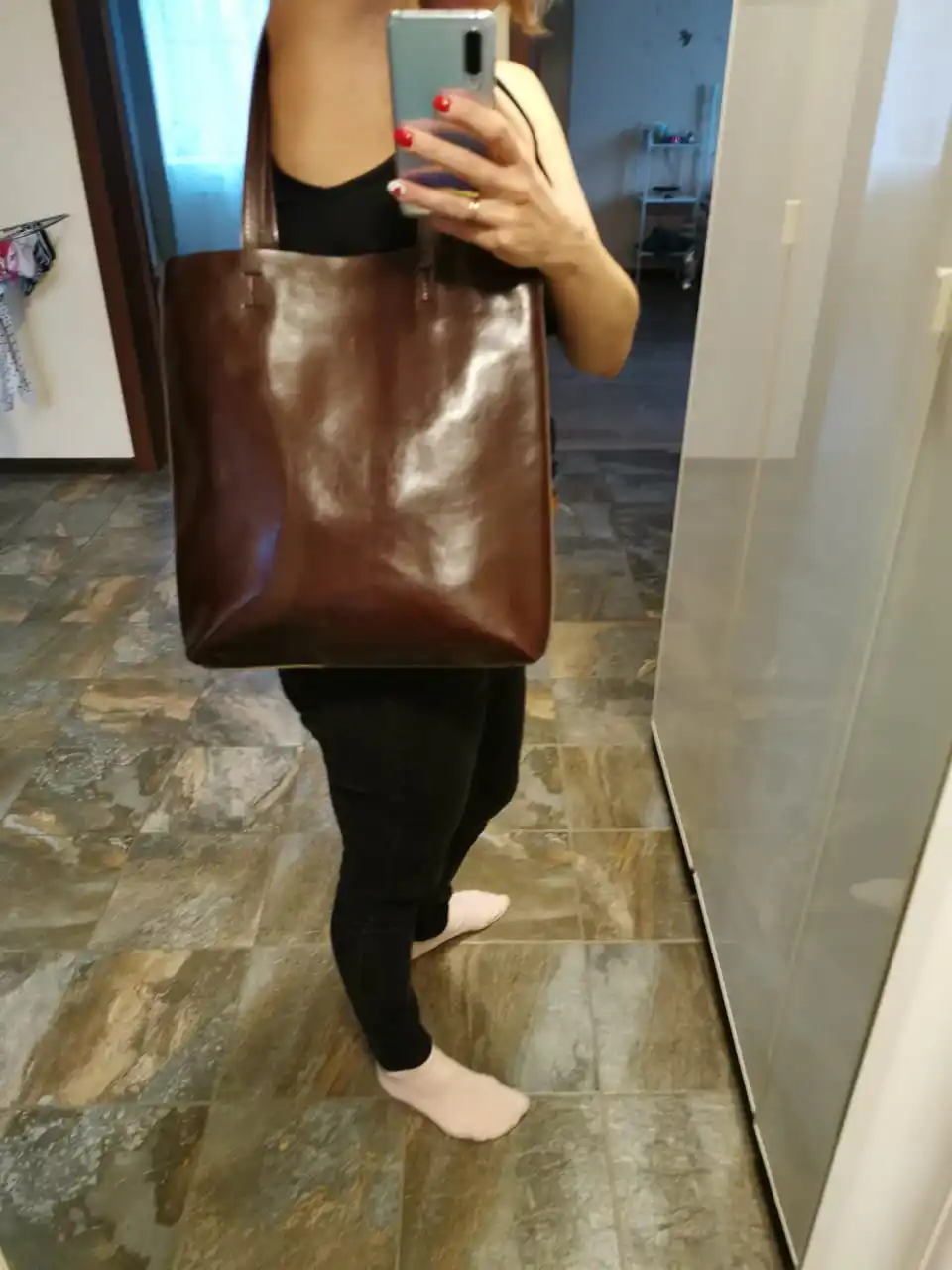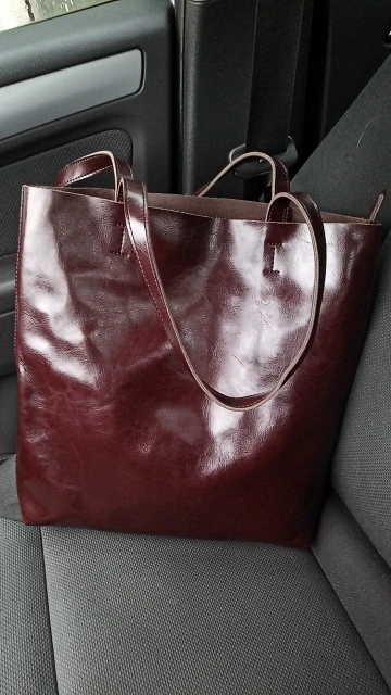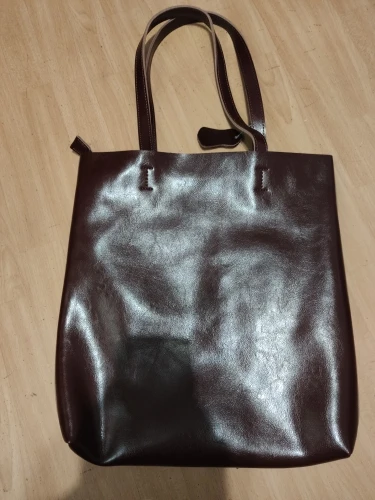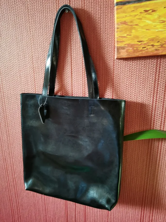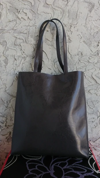 Сумка из довольно толстой кожи , ручки не очень длинные и довольно твёрдые, не самые удобные , но носить можно. Сумка без дна, то есть сшита как пакет из двух половинок, но довольно вместительная. За свою цену нормальная сумка, выглядит стильной, кожа немного блестящая, ставлю 5. Привёз курьер в Москву буквально через 4 дня после оформления заказа.