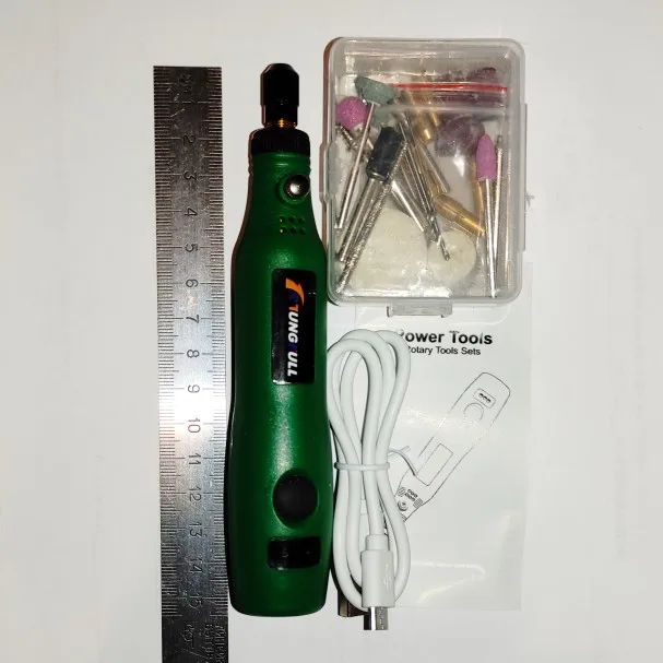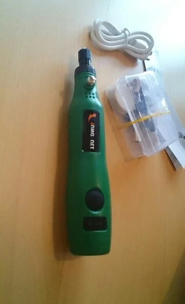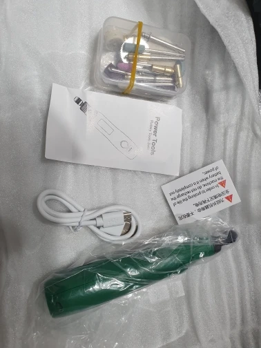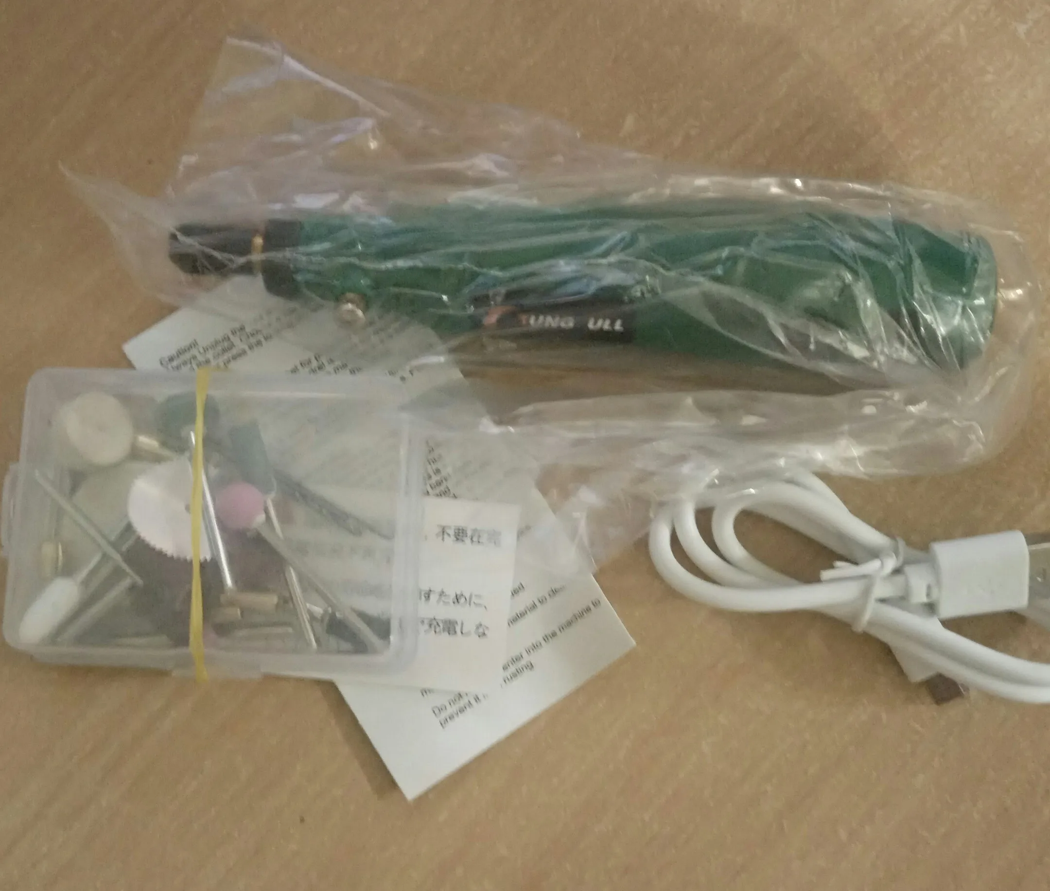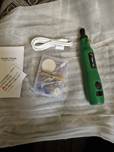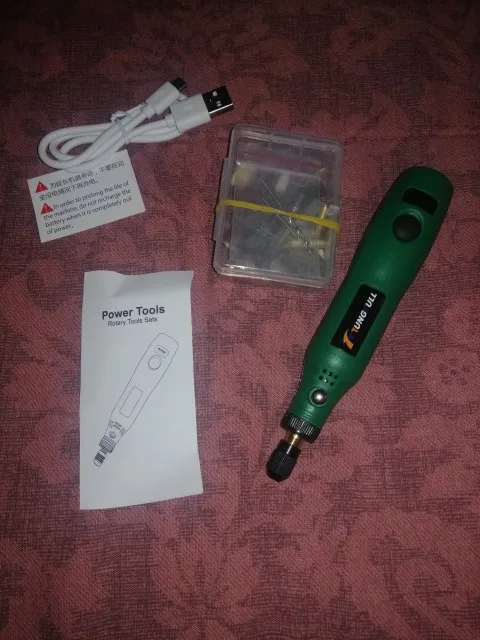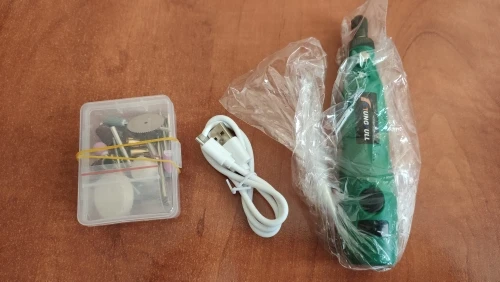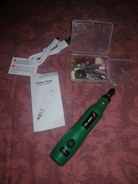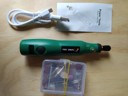 Удобный недорогой аккумуляторный мини-гравер с базовым комплектом насадок, включая сменные цанги. Отлично лежит в руке, три скорости переключаются последовательным нажатием кнопки "пуск". Набор насадок в пластиковой коробочке + зарядный кабель короткий (mini-USB), инструкция на английском языке. Брал на смену проводного аналога (12В). По ощущениям, не уступает по крутящему моменту. Конечно, это не мощный Dremel или Hilty, но свою задачу подшлифовать-подрезать-подполировать выполняет на все сто! Годится даже для шлифовки ногтей (с алмазными насадками, конечно) - безопасный вариант! :-) Покупкой доволен. Доставили в Москву менее, чем за две недели (в "Пятёрочку"). Трек отслеживался. Полностью заряжен. Описанию соответствует полностью. Рекомендую товар и поставщика!