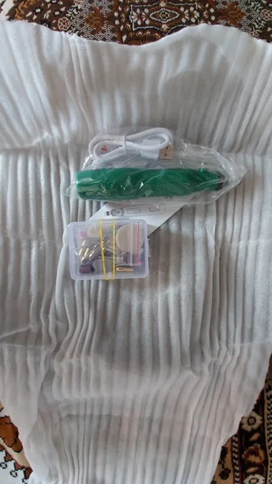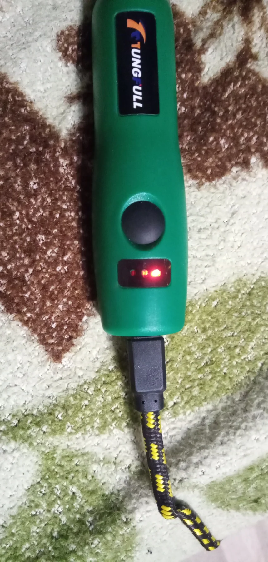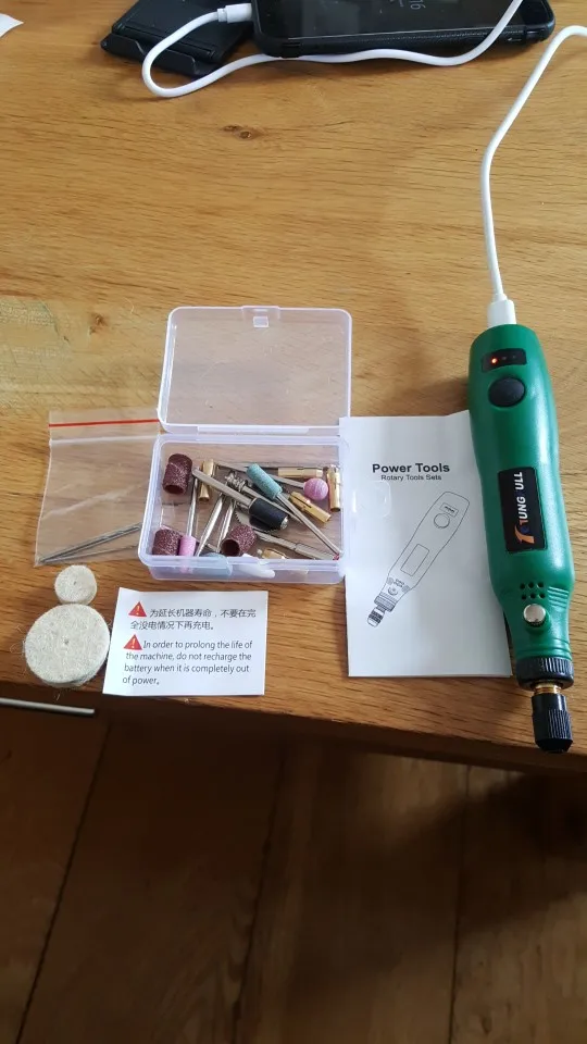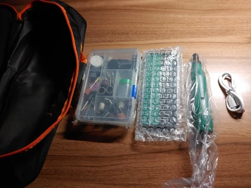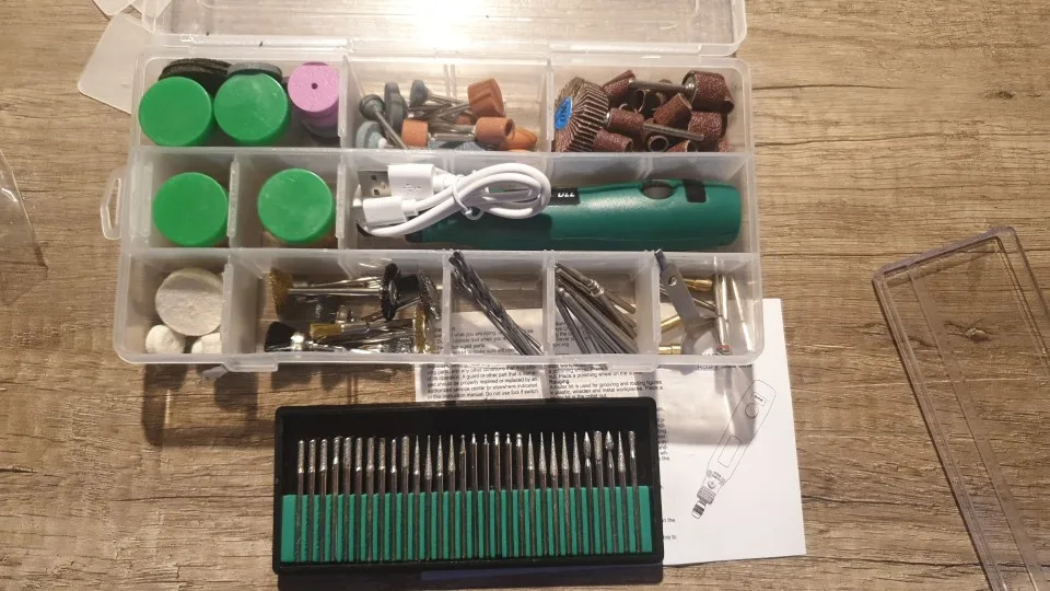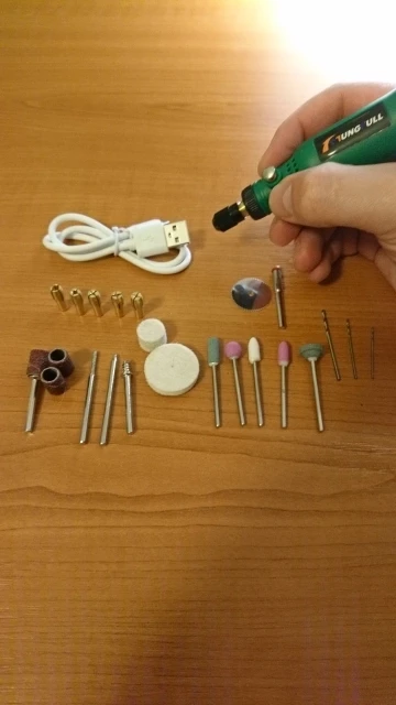 Удобный недорогой аккумуляторный мини-гравер с базовым комплектом насадок, включая сменные цанги. Отлично лежит в руке, три скорости переключаются последовательным нажатием кнопки "пуск". Набор насадок в пластиковой коробочке + зарядный кабель короткий (mini-USB), инструкция на английском языке. Брал на смену проводного аналога (12В). По ощущениям, не уступает по крутящему моменту. Конечно, это не мощный Dremel или Hilty, но свою задачу подшлифовать-подрезать-подполировать выполняет на все сто! Годится даже для шлифовки ногтей (с алмазными насадками, конечно) - безопасный вариант! :-) Покупкой доволен. Доставили в Москву менее, чем за две недели (в "Пятёрочку"). Трек отслеживался. Полностью заряжен. Описанию соответствует полностью. Рекомендую товар и поставщика!