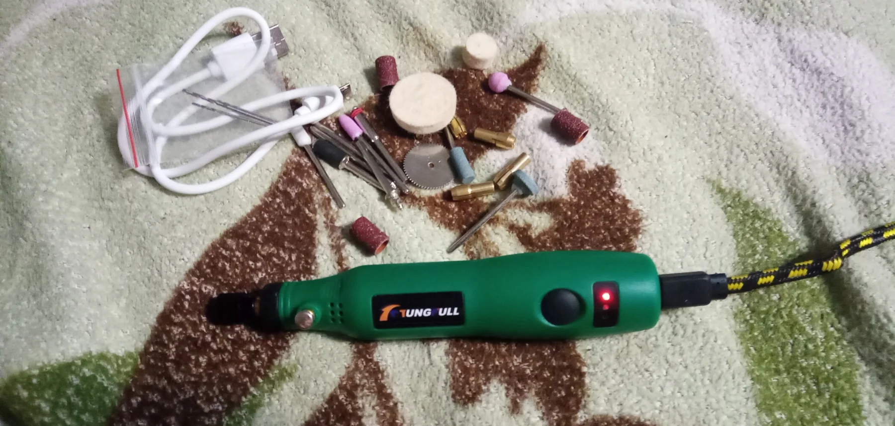 Сцылко на видос на ТыТрубе: OFbE-92YPCg Приехал быстро! Отличный, дешевый и качественный инструмент. Минимального набора более чем достаточно, крутиться мощно, остановить пальцем тяжело. В комплекте как насадки для ногтей, так и для резки печатных плат. Также есть 3 сверла минимального диаметра. Для начала этого всего достаточно.
