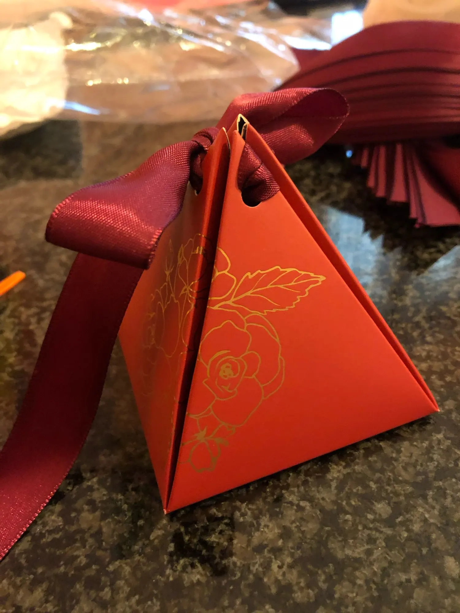 Супер бонбоньерки! Качество отличное и все аккуратно упаковано. Единственное, на фото цвет самой коробочки близко к цвету ленты, а на самом деле коробка больше к красному. У меня влезло 5 конфет без проблем.