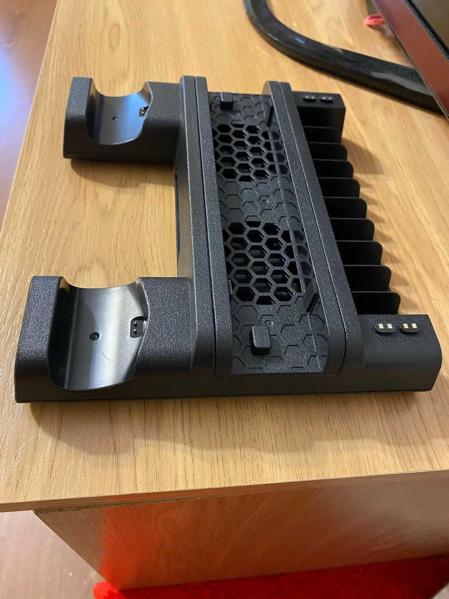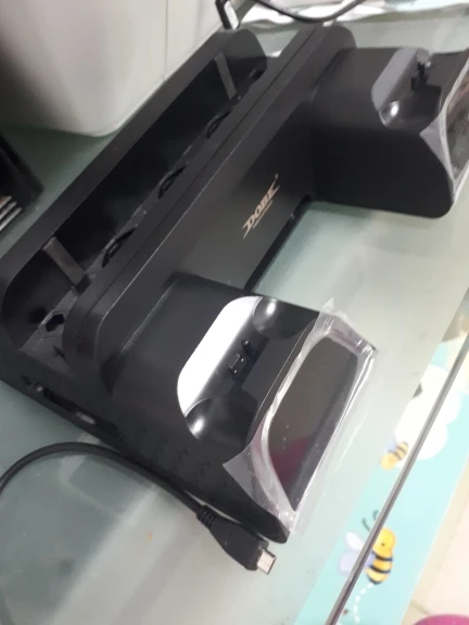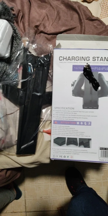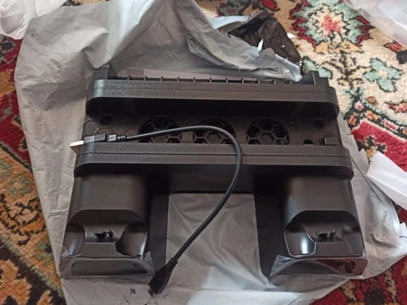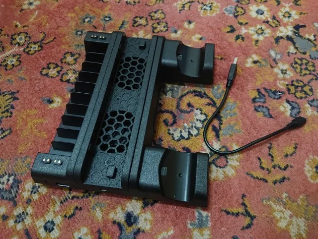 Пришла небольшая коробочка(мне думалось она будет больше). Содержимое коробки это подставка, шнур для неё, инструкция и в самой подставке специальные насадки которые вставляются в джойстик доя подзарядки(постарался показать их на фото что бы было понятно). Подставка работает как и должна. Вентиляторы дуют(довольно таки тихо и включаются с кнопки на подставке), джойстики заряжаются(если вы все правильно сделали), диски держатся на подставке плохо выпадают(но не критично). В целом все работает как надо. Моё впечатление было испорчено царапиной(скорее всего полученной при упаковке). Её видно на фото(находится на одной из подставка доя джостика). Хороша вещь если бы не это поставил бы оценку выше