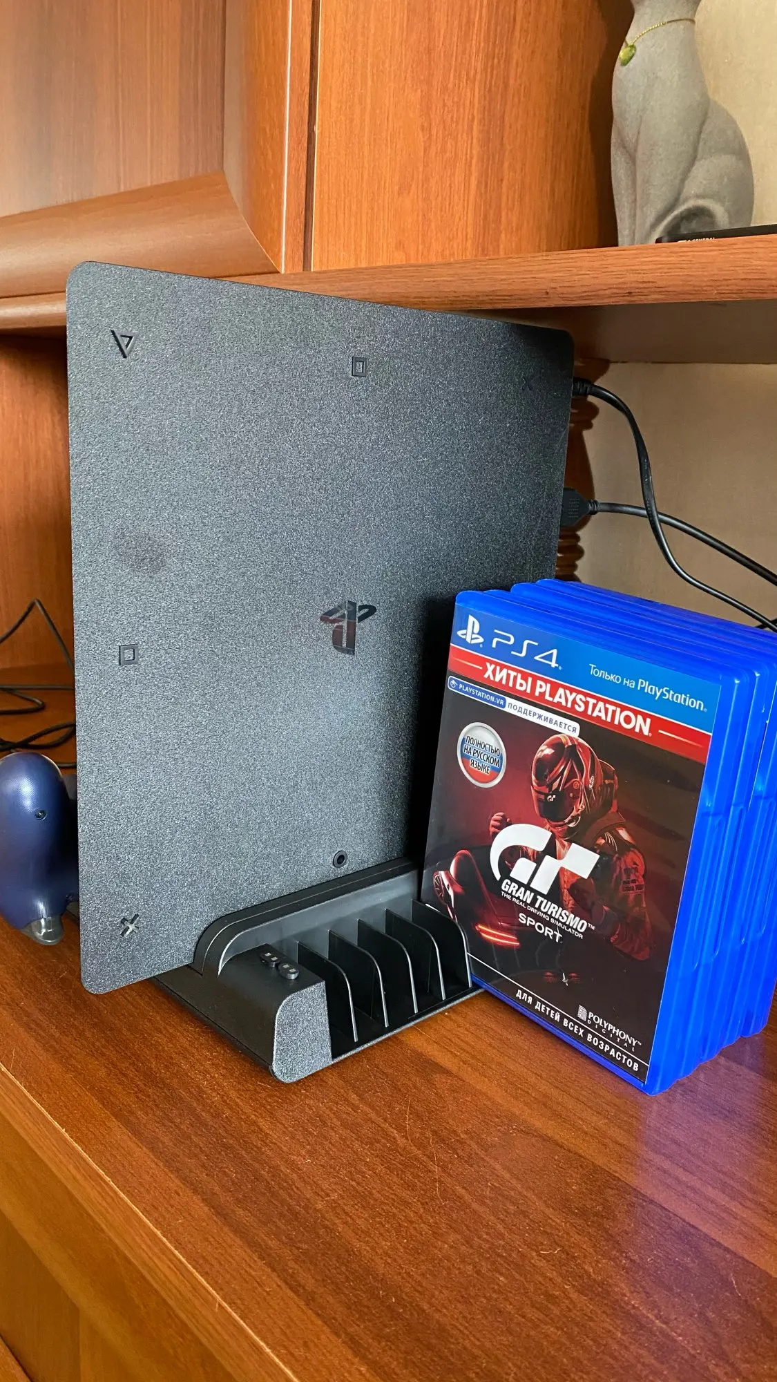 плюсы: Подставка очень хорошая, устойчивая. Геймпады заряжает. Инструкция понятная. Упакован очень хорошо. минусы: некоторые слоты для дисков широкие, некоторые коробки плохо держатся; когда приставка находится в "спящем режиме", подставка не работает Доставка полтора месяца