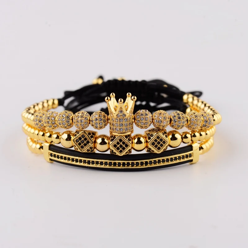 Amader 3 шт.компл. Роскошный CZ шар Корона очаровательные медные бусины макраме браслеты для мужчин ручной работы Длинные трубки Набор браслетов и браслетов для женщин