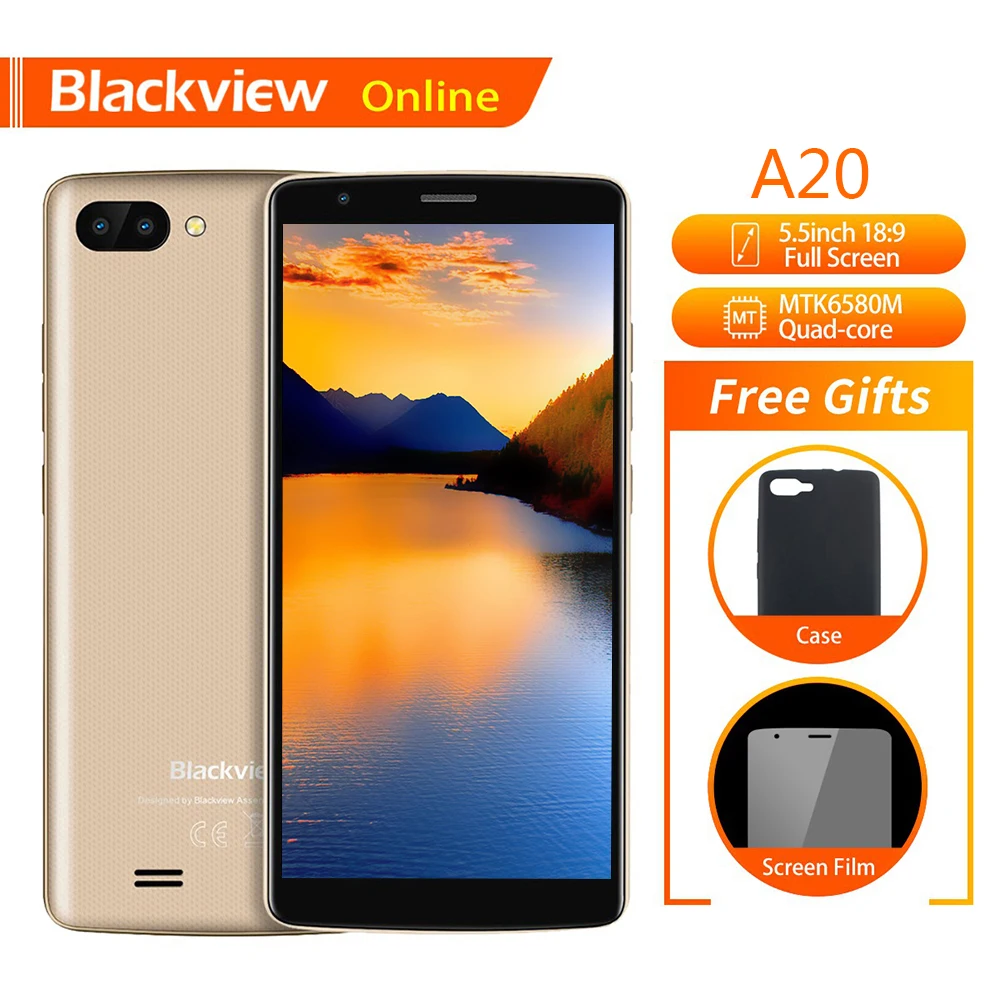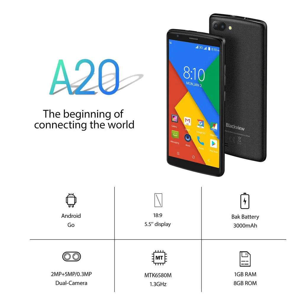 Оригинальный смартфон Blackview A20, экран 5,5 дюйма, 1 Гб + 8 Гб, четырёхъядерный процессор MTK6580M, Android GO 18:9, 3G, две SIM-карты, модный тонкий мобильный телефон