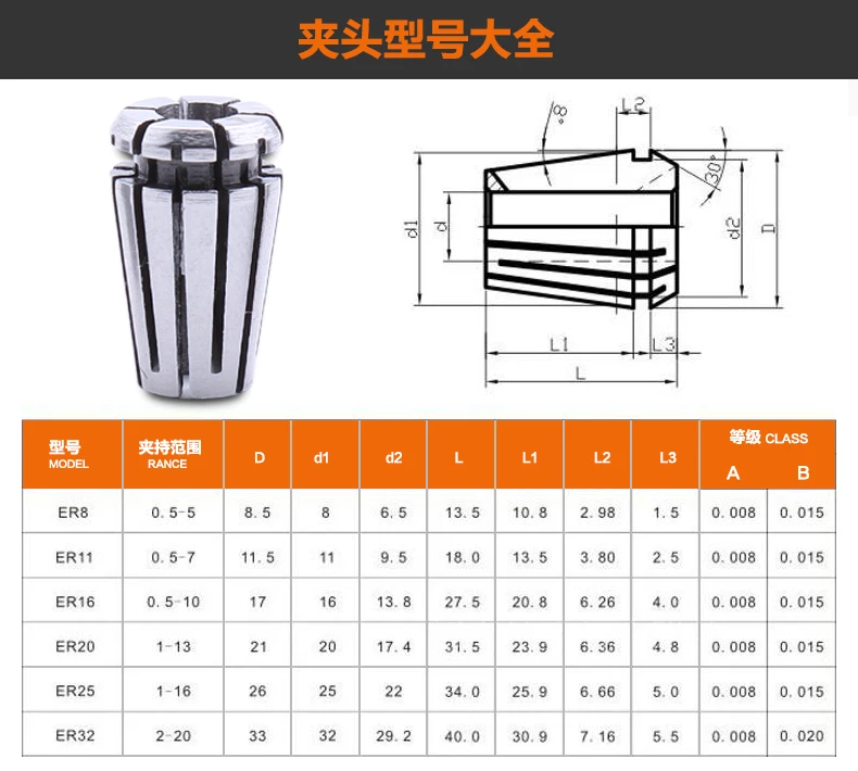 Спецификация:Модель: ER16Материал: стальТочность: 0,015Диапазон: 1 мм-10 мм