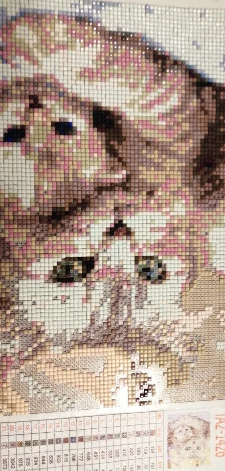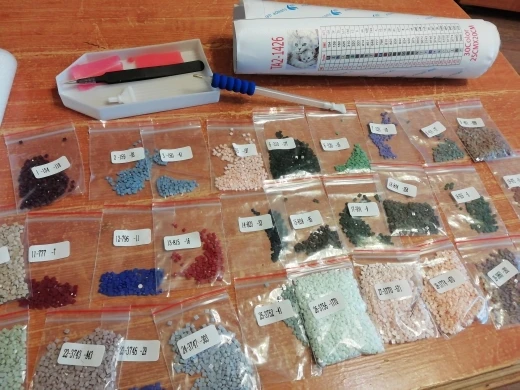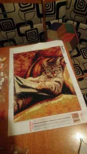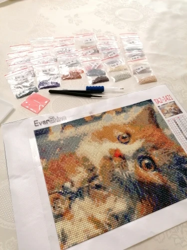 Спасибо огромное. 4 вечера и картина готова. Котёночек сверкает и ждёт свою рамку. Алмазов много. В комплекте есть пинцет, ручка, пластинка с липким слоем и насадка для нескольких камушков. Картинка очень чёткая. Цветов много. С новым годом!!!!