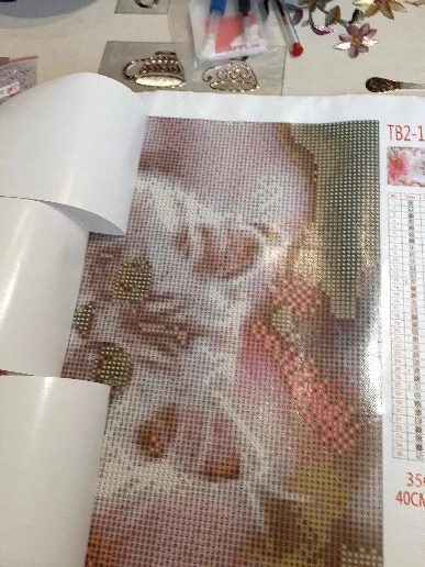 Хорошая мозаика, довольна. Упаковано в пупырку, края целые, стразов на 10% больше, чем нужно. Уже сделана шестая часть, только один бракованый стразик. Стразы в пакетиках, подписаны - номер цвета, количество. Цвета подобраны хорошо, получаемой картинкой довольная