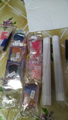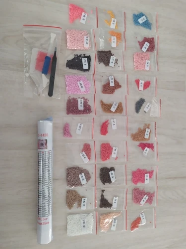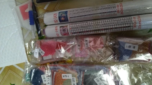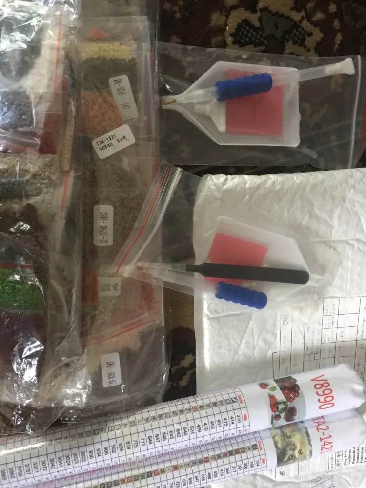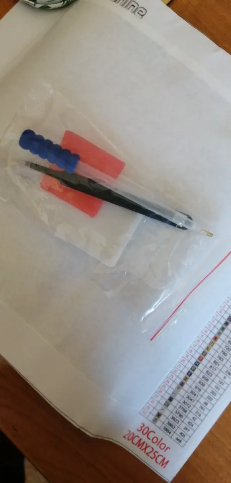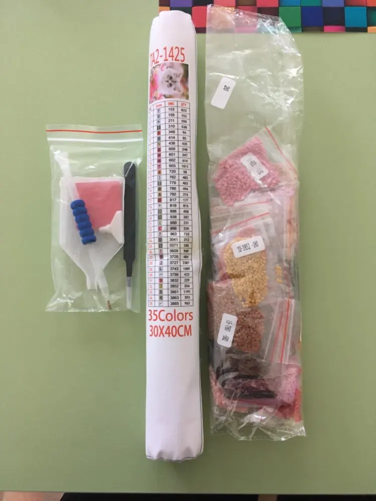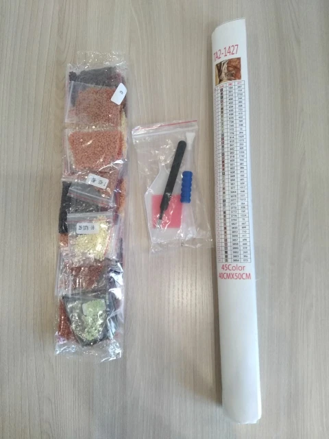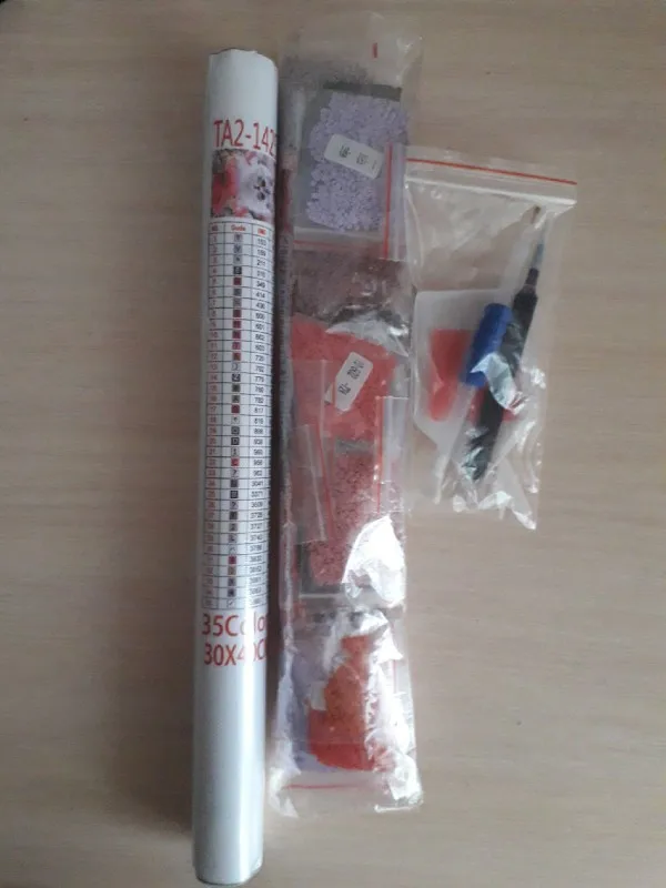 заказ пришёл очень быстро. в наличии 35 цветов, пинцет, ручка и ванночка. другие продавцы пинцет никогда не присылали. Картина спрятана под плотную бумагу. Пришла на валике, заломов нет. Продавца рекомендую.