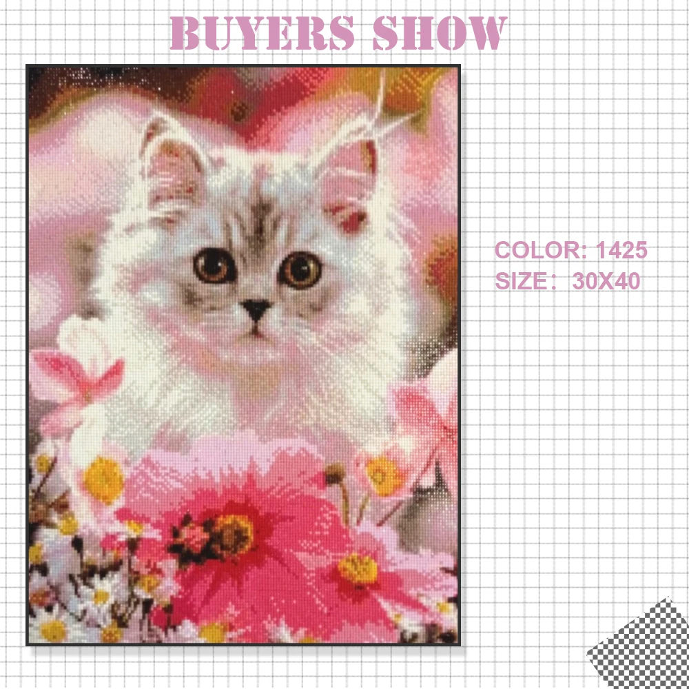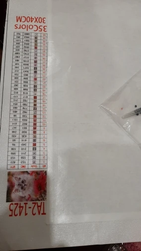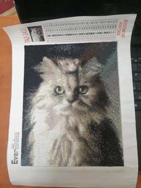 кот пришел достаточно быстро. в комплекте все необходимое. жаль только размер не совсем 30*40. а чуть меньше где-то на пол см или см. в целом все ок. качество хорошее. алмазиков с запасом. 35 цветов