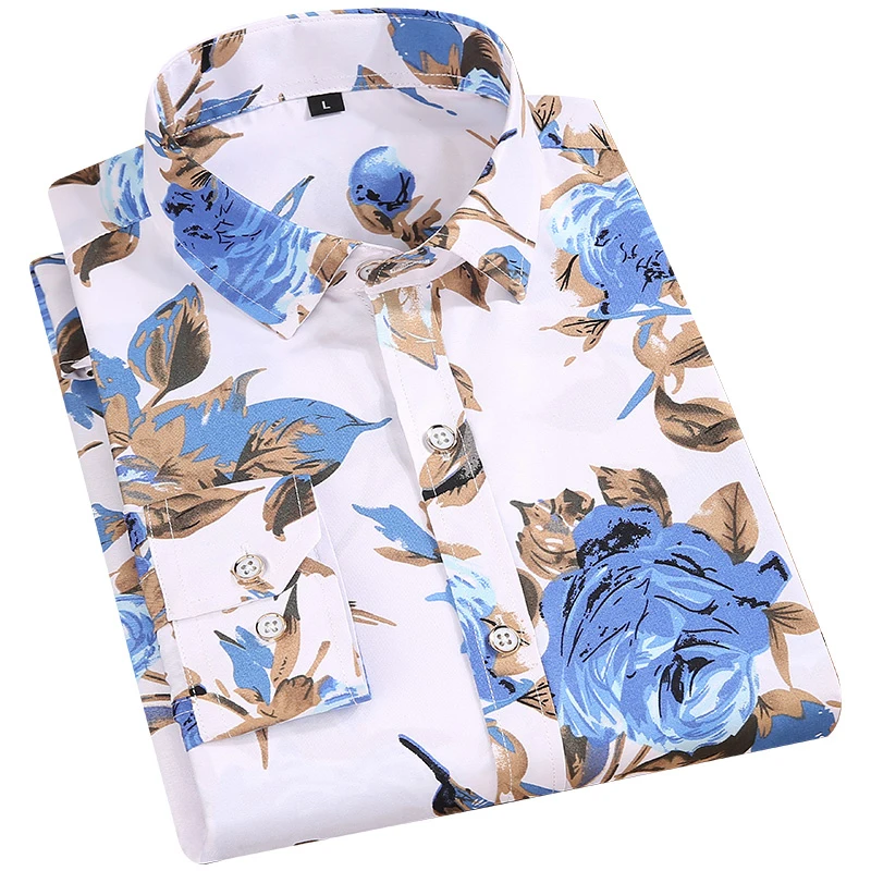 Мужская приталенная рубашка с длинным рукавом, с цветочным принтом
