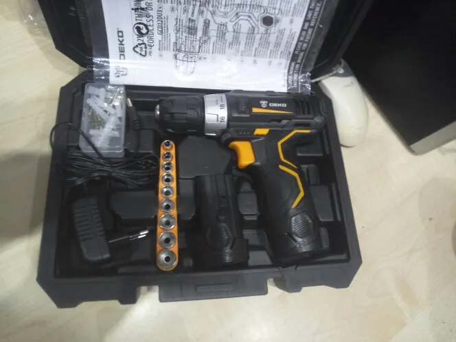 Шуруповёрт с комплектом бит и свёрлами для работ по дереву, металлу и бетону с двумя аккумуляторами за такие деньги - подарок судьбы! Патрон не бьёт, плавное изменение оборотов, мгновенная остановка патрона! Покупаю уже второй комплект. Первый купил сыну, а сейчас не удержался, купил себе. Думаю лишний шуруповёрт за 1600руб не помешает!) Рекомендую этот чудесный товар и продавца. Заказ пришёл меньше чем за неделю в Москву!