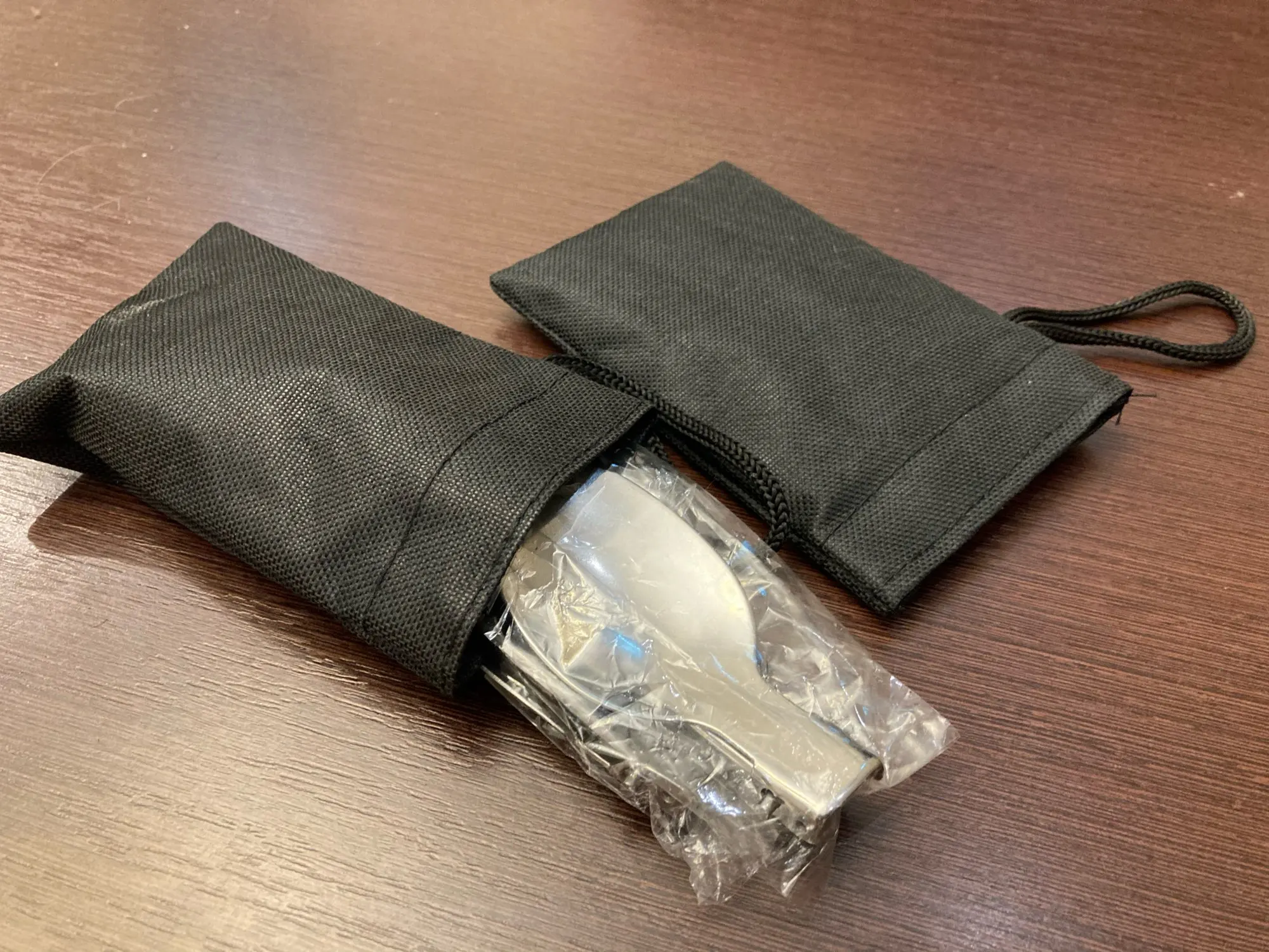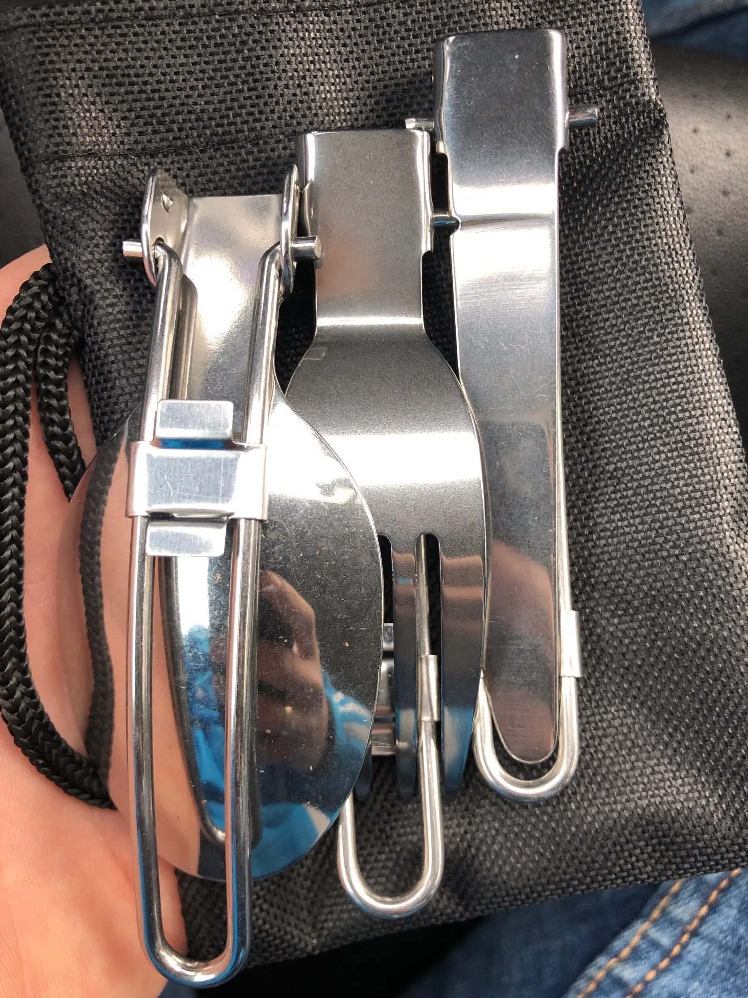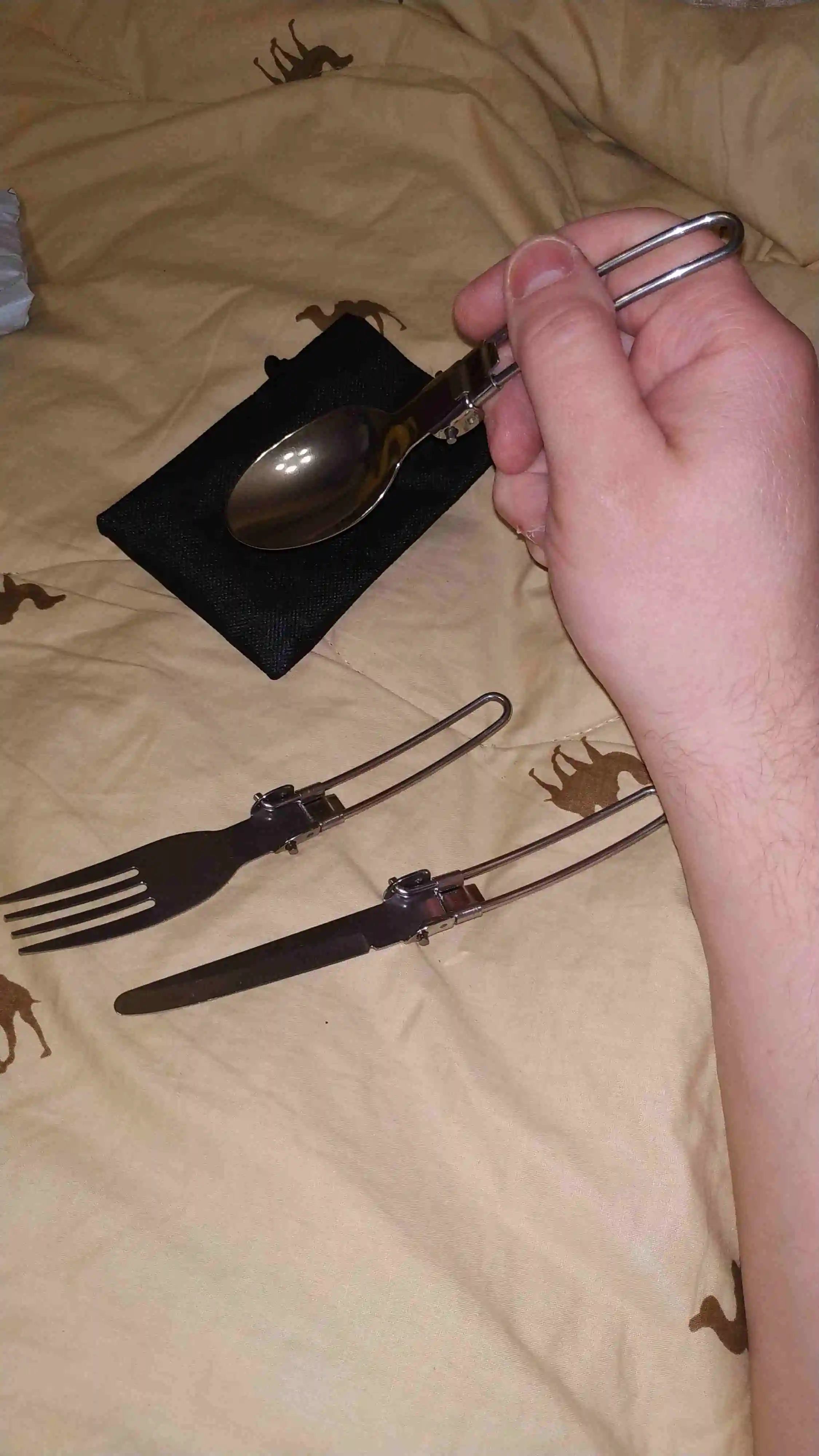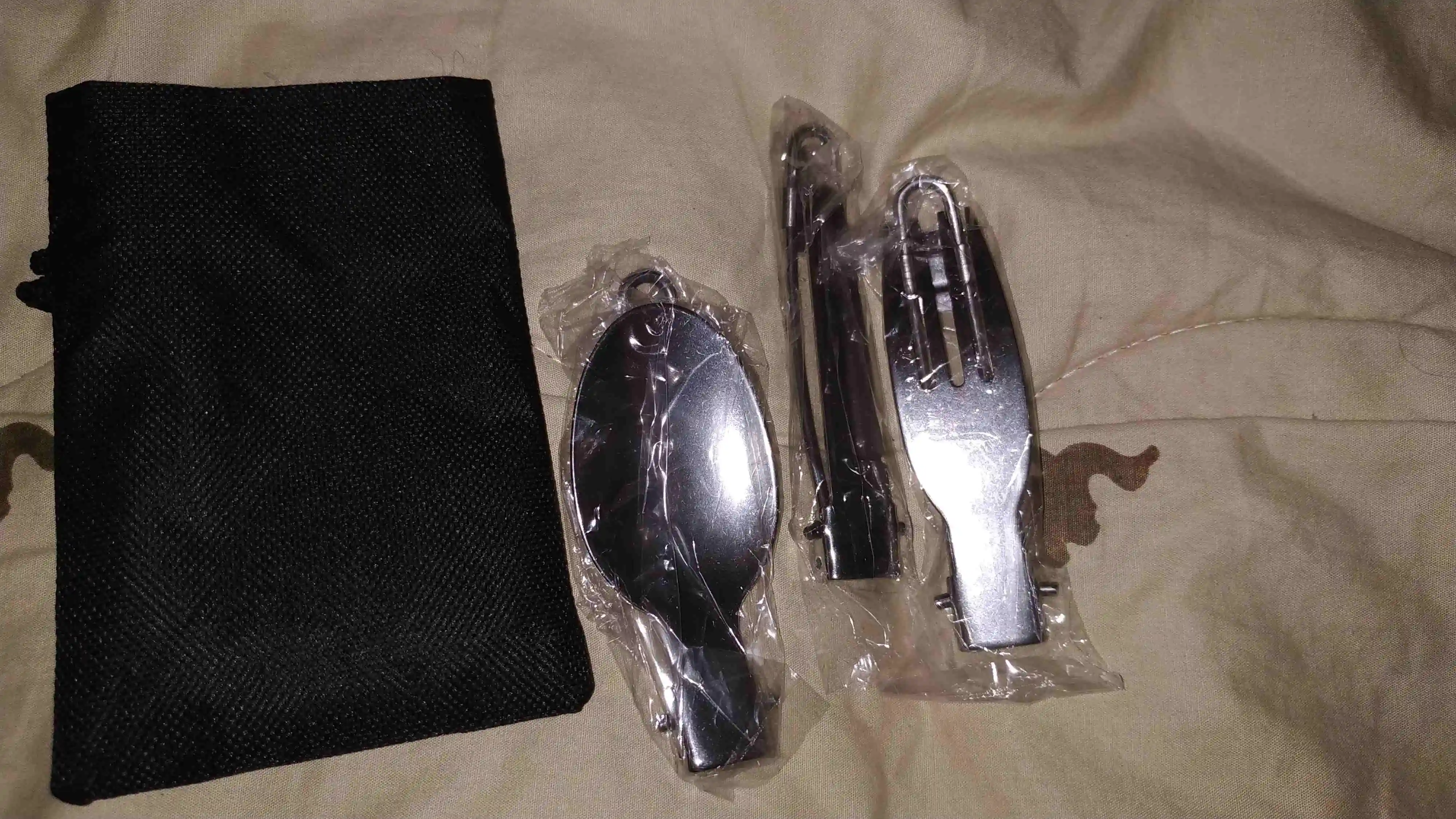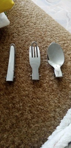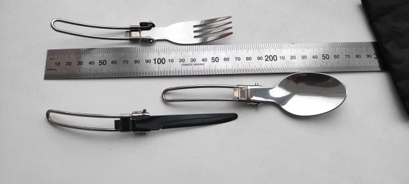 Заказ пришёл быстро и отслеживался весь путь. В края чехла вшита липучка, хорошо удерживающая столовые приборы внутри. На чехле имеется небольшая петля. Сами приборы лёгкие - 71 грамм. Фиксатор надежно фиксирует приборы в открытом положении. Столовые приборы легко разбираются на составные детали. Вилка удобная. Ложка не слишком глубокая но сайде. Нож имеет заточку но чисто номинальную