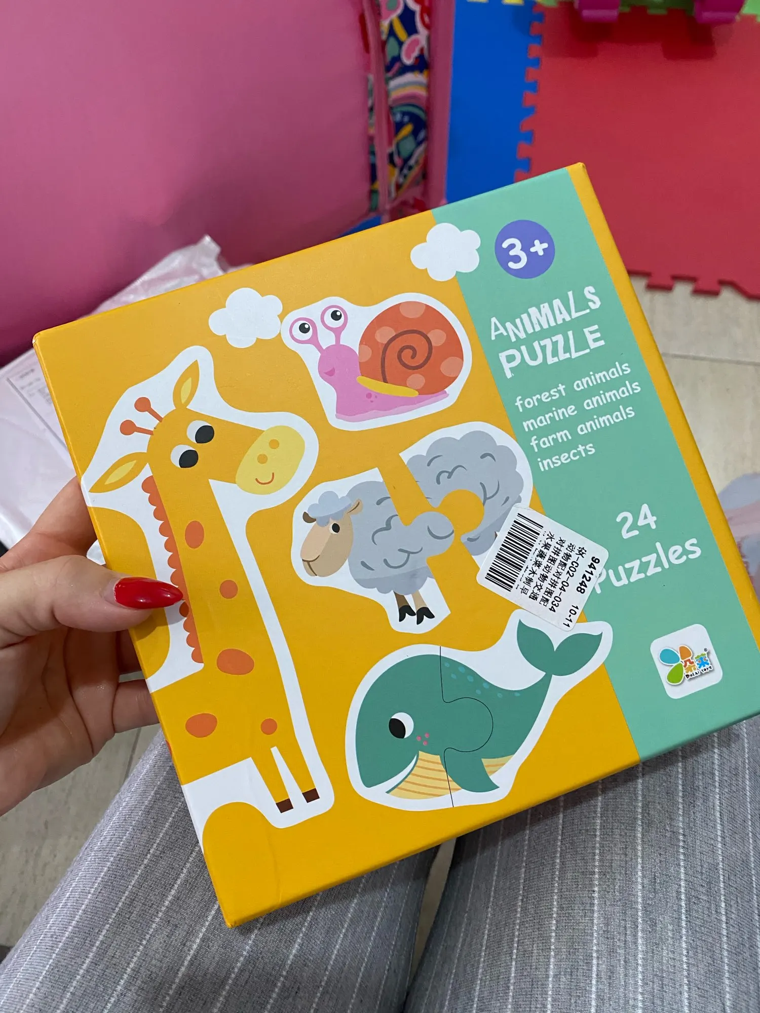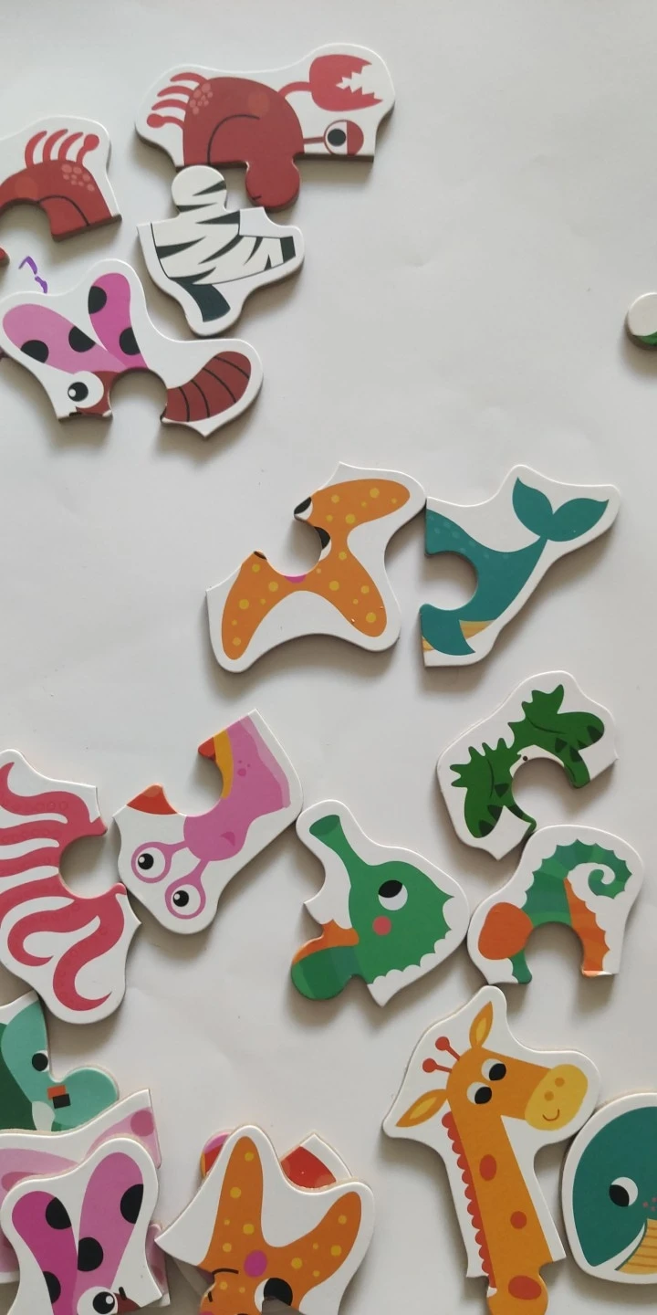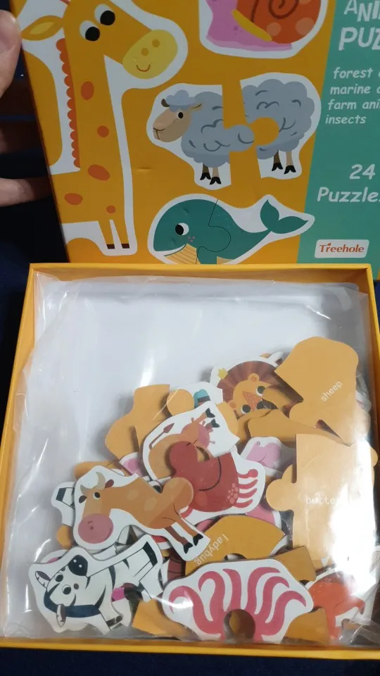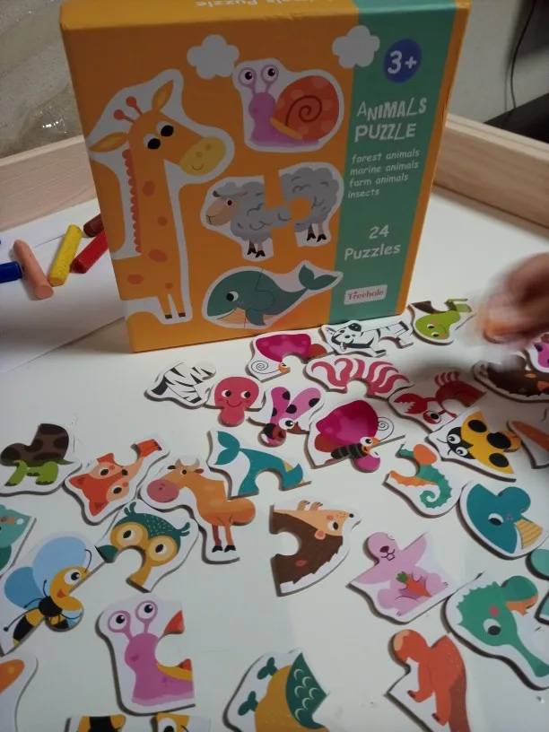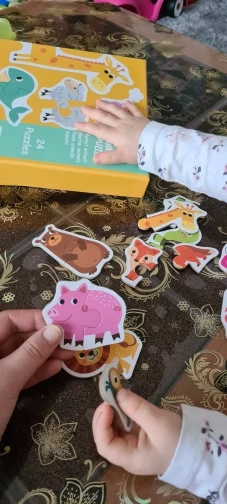 Рисунки очень хорошие, и я думаю, что они идеально подходят для самых привлекательных. У моей дочери 20 месяцев все еще есть проблемы с установкой деталей, но она любит идентифицировать животных и искать пары (Каждое животное 2 штуки). Я разделил их на 2 пакетика, потому что многие животные приходят, поэтому я не насыщаю их слишком сильно. Единственная палка в том, что это картон, как и большинство пазлов, он портится, если вы забудете и приклеите его в рот. Я очень доволен покупкой
