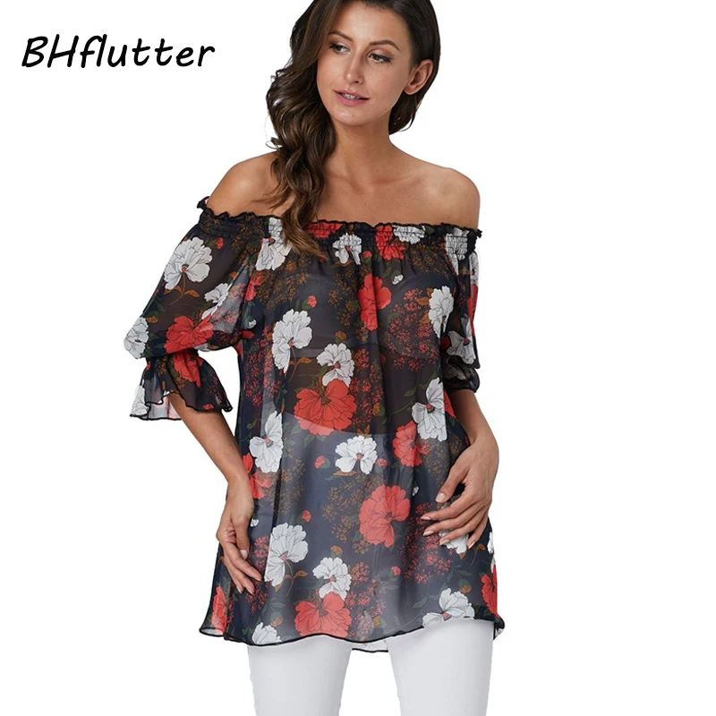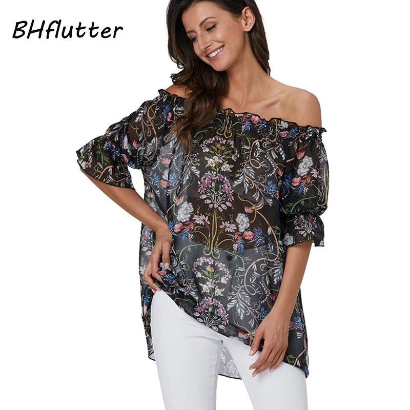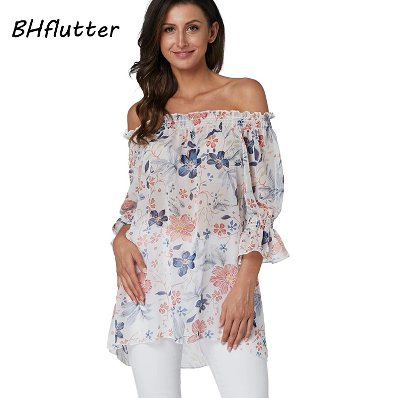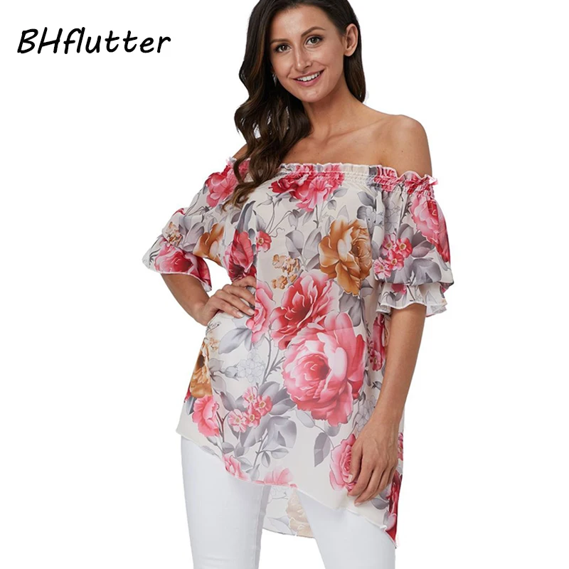 Женская шифоновая блузка BHflutter, Белая Летняя Блузка с открытыми плечами, с цветочным принтом в стиле бохо, 2019