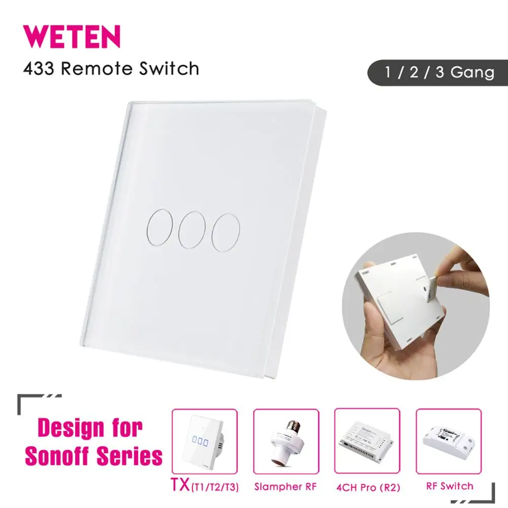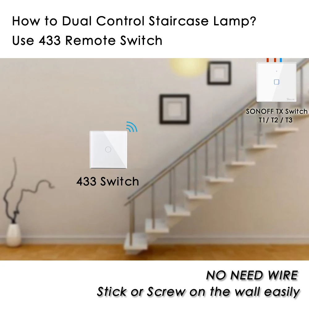 Этот выключатель питается от пальцевой батареи. Вам не нужно его провожать. Просто приклейте его на стену или прикрутите к своей оригинальной коробке переключателей. Вы также можете свободно изменить положение.При сопряжении с переключателями, поддерживающими пульт дистанционного управления 433, такими как переключатель Sonoff TX (T1/T2/T3 ). Он сможет управлять одним светом из разных свойств, не меняя старые провода. Это широко используется вЛестница или спальни.