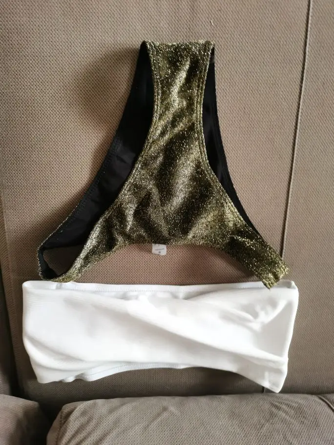 Эффектный купальник. Очень удачная модель. Плавки бразильской посадки, завышенная. Прекрасно держит грудь. В боковых швах топа имеются косточки. Благодаря этому он не сползает. Прекрасно держит грудь. Есть вкладки. + Ткань трикотажная в рубчик, не сильно тянется. Поддержка идеально. На 88 – 60 – 94 грудь третий размер подошел отлично. Плавки из ткани с люрексом. Немного колется, но только с наружной части