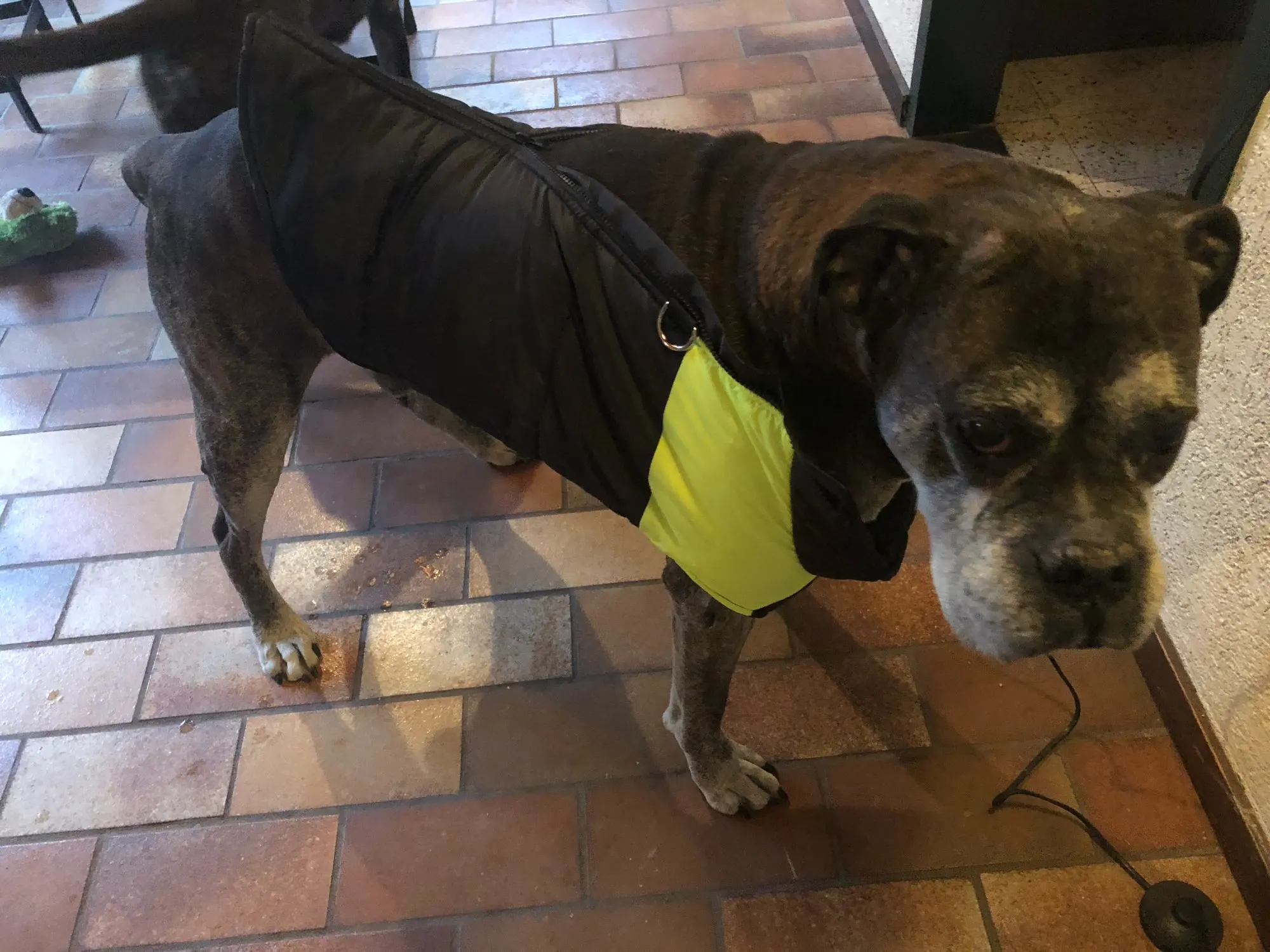 Жилетка пришла через 3 недели, лёгкая, скорее на осень, чем на холодную зиму. По размеру подошла хорошо, таблице соответствует. На питбуля девочку брали 4ХL