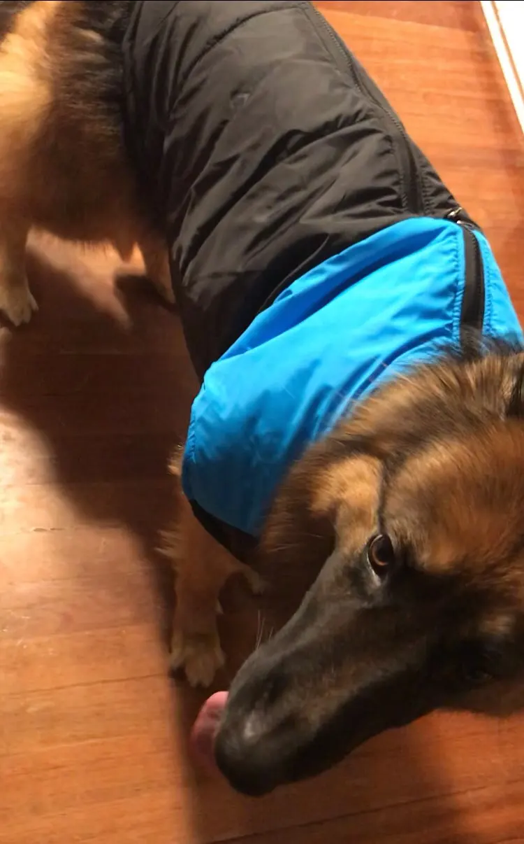Perfecto, 6XL Pastor alemán hembra de 27kg. La queda algo grande, pero creo que así tiene más facilidad de movimiento. Es calentito e impermeable. Y lo mejor de todo, es que al tener la cremallera arriba, no se moja la barriga, que en su caso al tenerla blanca, es lo que más se mancha. Lola está encantada, y nosotros también, a si que hemos comprado otro pero en rojo!! Lo que no me he atrevido a probar, son las anillas de sujeción que lleva el chaleco, porque ella tira mucho e igual lo rompe. Pero es perfecto para poner collar o arnés encima.