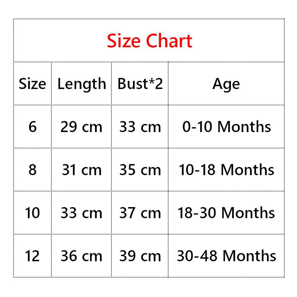 Размеры Длина Бюст * 2 Возраст 6 29 см 33 см 0-10 месяцев 8 31 см 35 см 10-18 месяцев 10 33 см 37 см 18-30 месяцев 12 36 см 39 см 30-48 месяцев