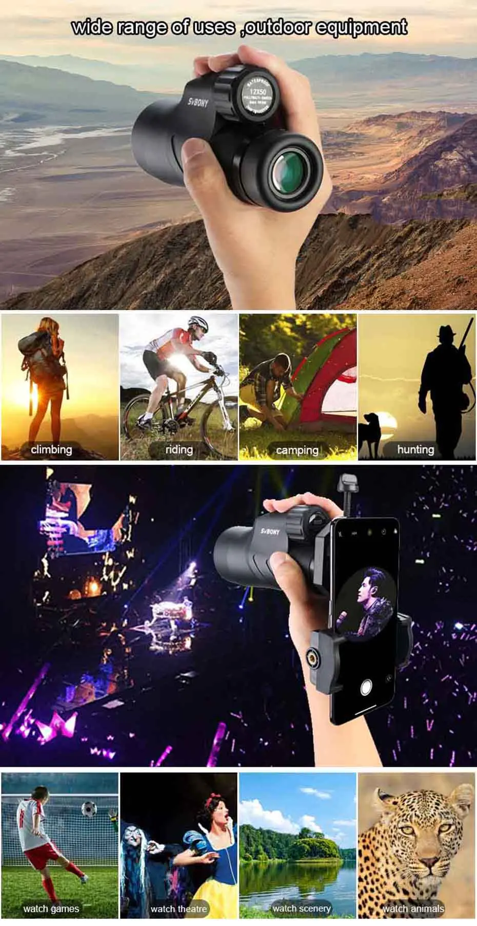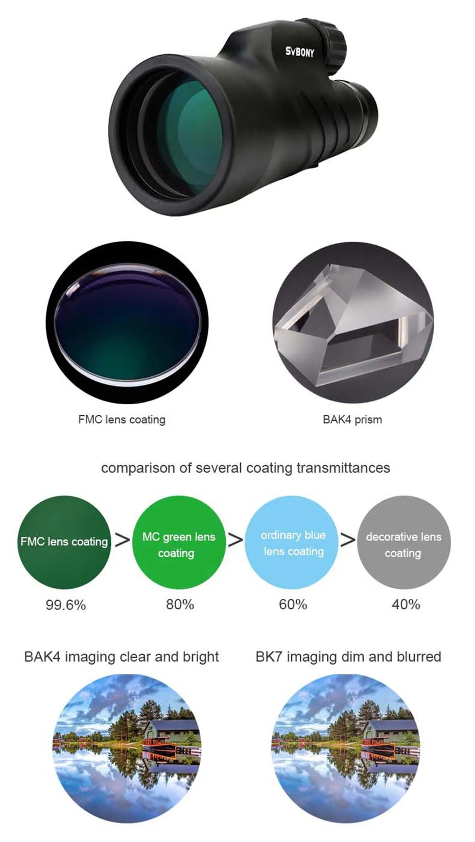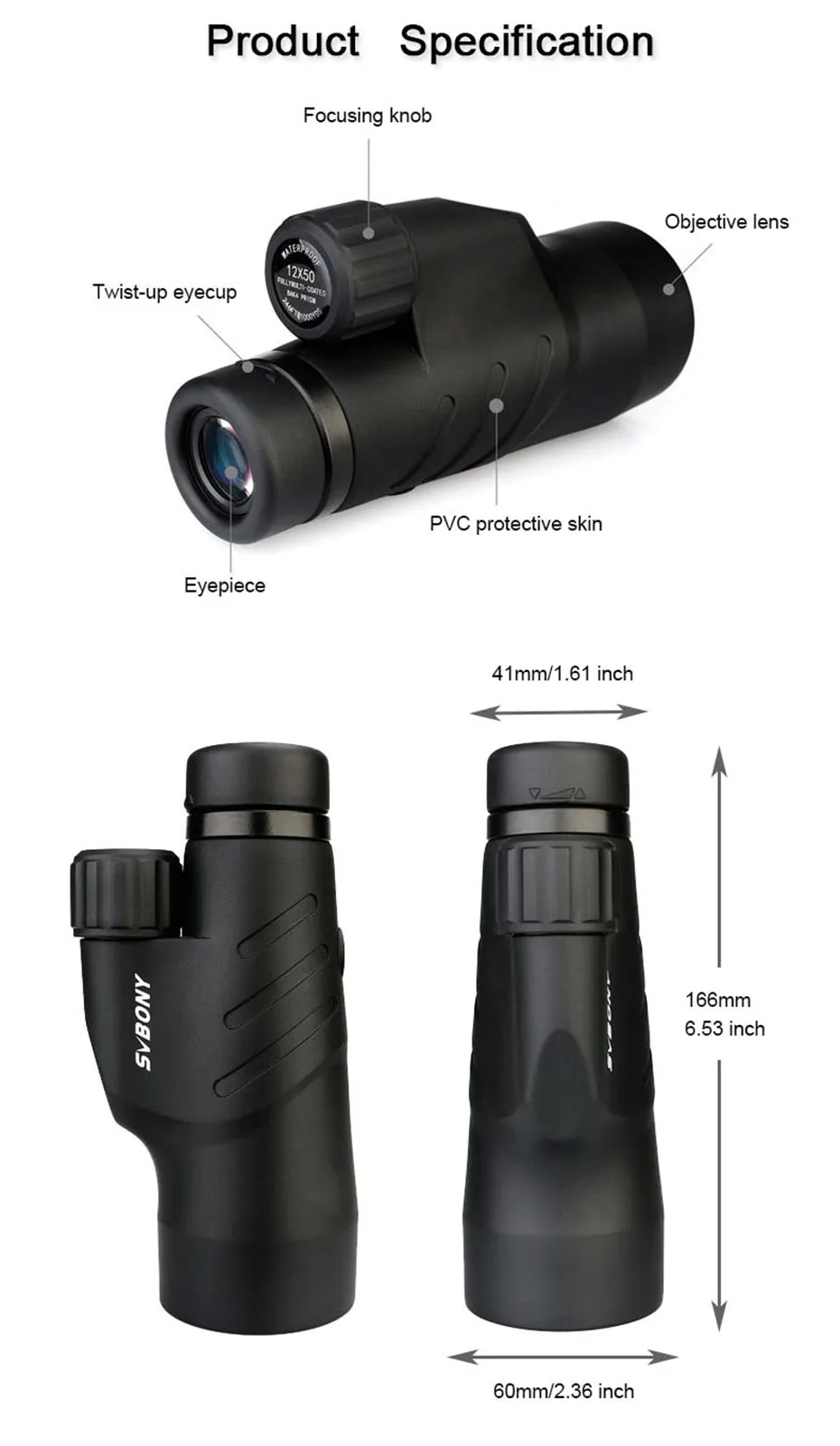 Телескоп SVBONY SV45 12x50, водонепроницаемый, IPX7, Призма BaK4, для путешествий, охоты