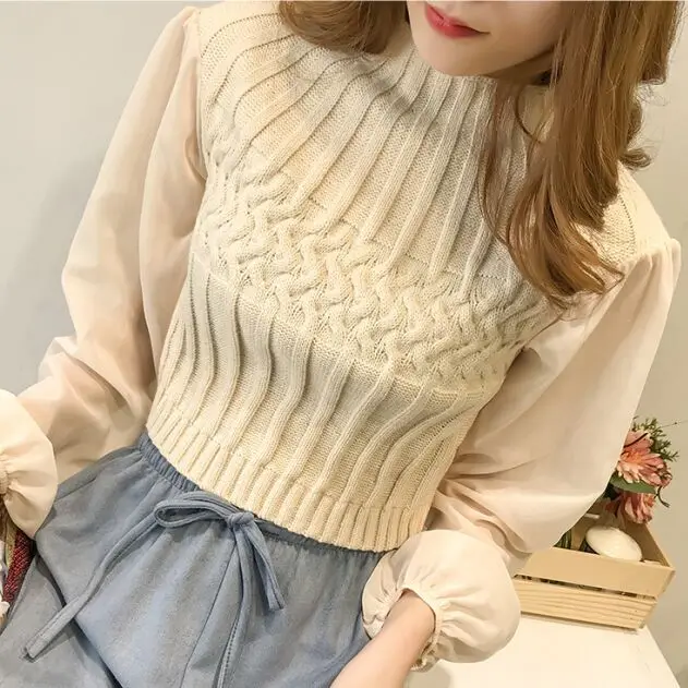 Женский Однотонный свитер с высоким воротником, укороченный пуловер, укороченный топ в стиле пэчворк, шифоновый свитер с рукавами для женщин, весна 2020