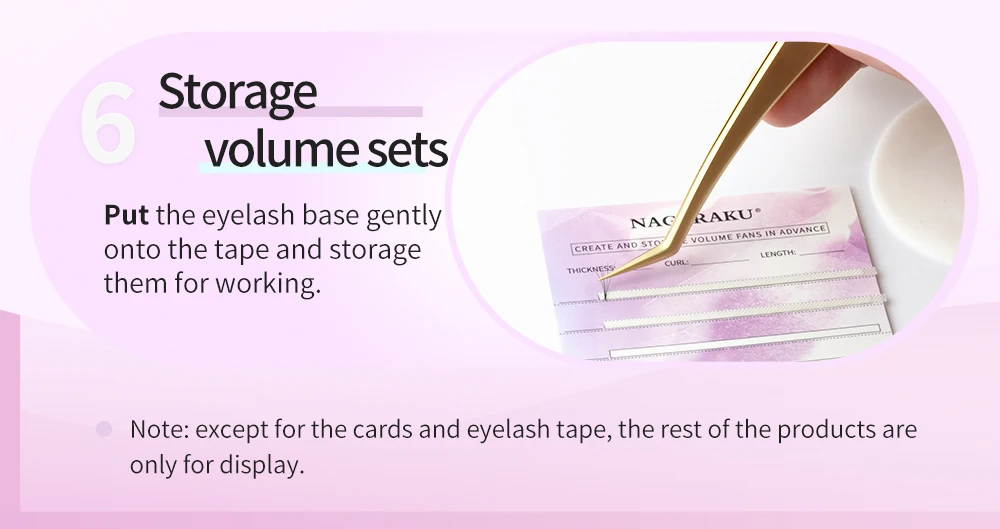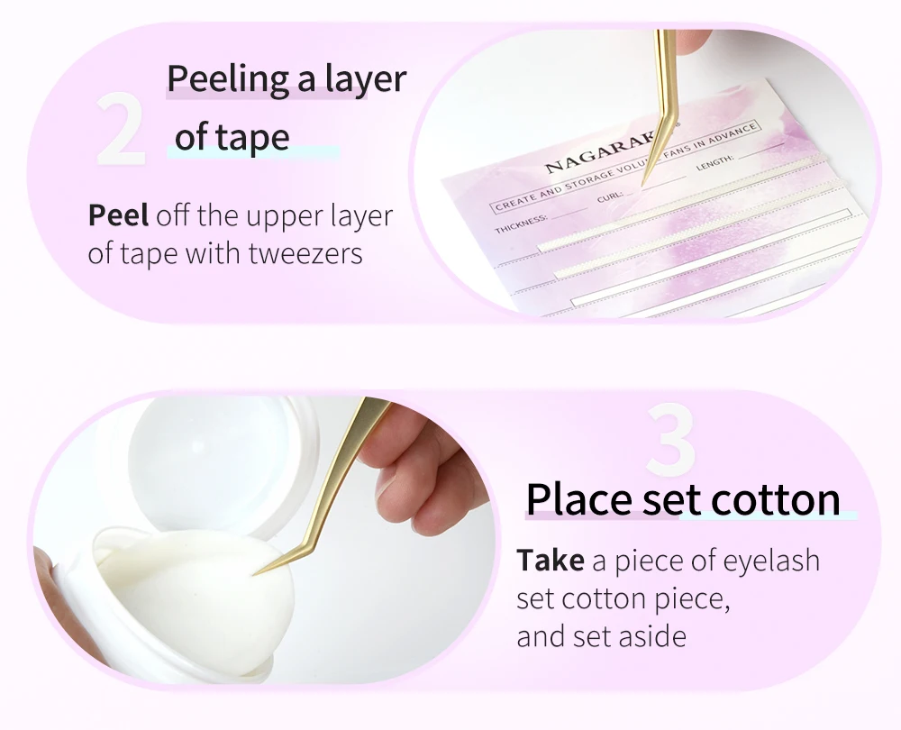 1: Отрежьте полоску: приклейте двустороннюю ленту и ножницами Отрежьте нужную длину;2: отслаивание слоя ленты: пинцетом снимите верхний слой ленты;3: пожалуйста, укажите хлопок: Возьмите кусок ресниц и отложите в сторону;4: изготовление вееров: Изготовление Объемных вееров с помощью пинцетов, затем окуните основу в клей;5: Укладка ресниц: Наденьте веер объема на хлопок;6: наборы для хранения объема: аккуратно Положите основу для ресниц на ленту и храните их для работы.