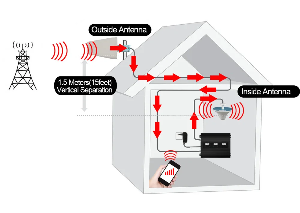 Наружная антенна, установленная на крыше, получает мобильный телефон и передает его на хост усилителя через коаксиальные перемычки. Хост усиливает мобильный сигнал и передает его в внутреннее пространство через внутреннюю антенну.