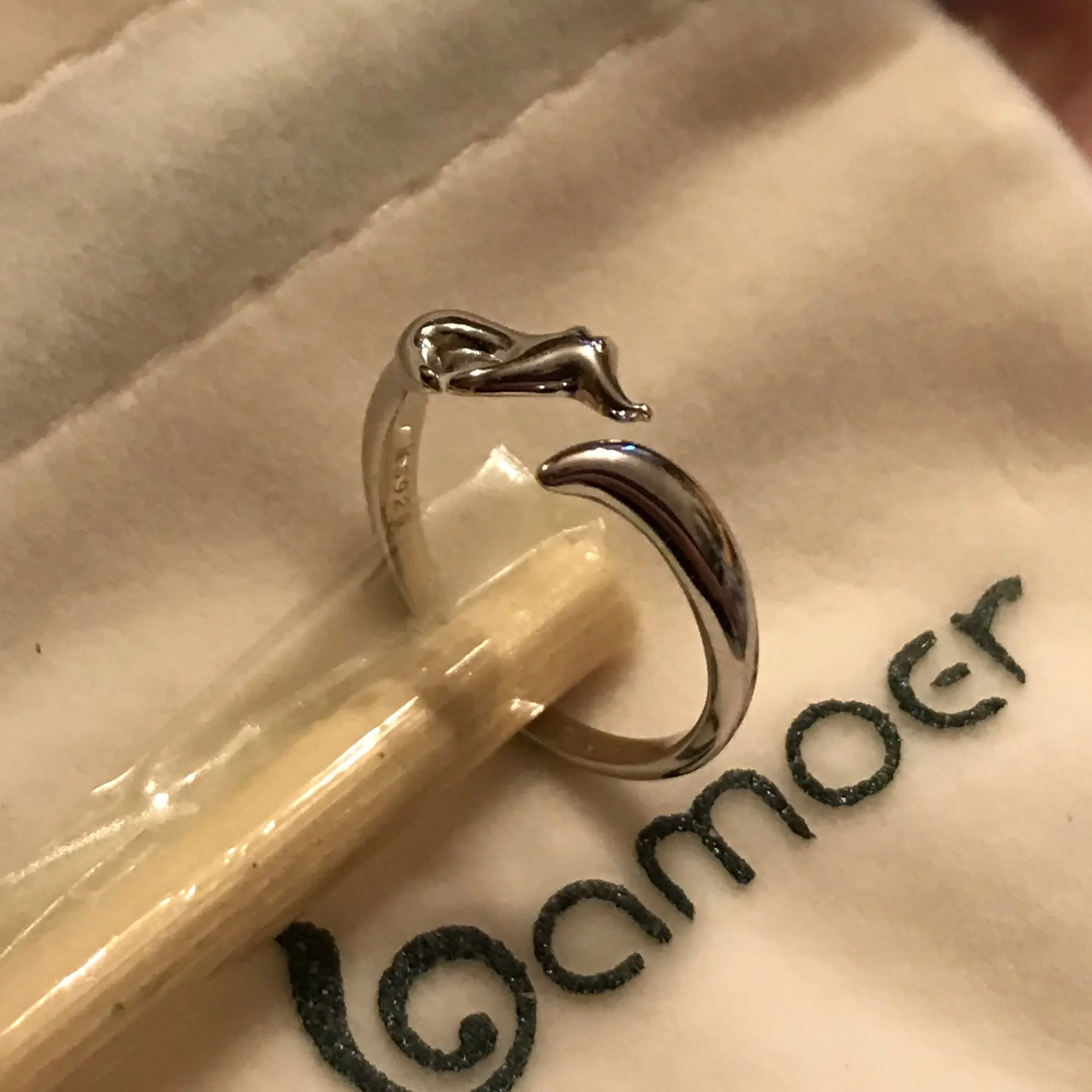 Лисичка прелестная ) Колечко в бархатном мешочке с логотипом. На фото колечко надето на палец объемом 16,8 мм. Комфортно. Не зажимает . На более полный палец можно немного разжать. Защемлять кожу не будет, потому что щель не с внутренней стороны руки. Доставка 3 недели до Нижнего Новгорода.