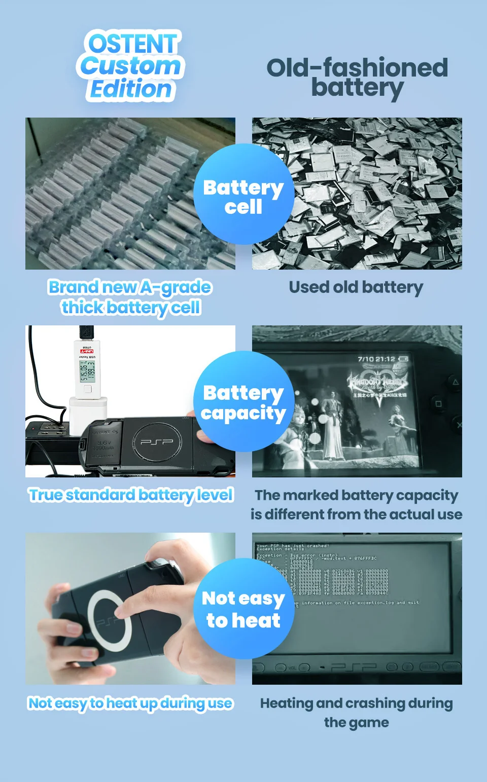 Здесь снова приведен один пример OEM батареи и сторонней батареи. Я не выбирал самый дешевый, думая, что это будет знак качества, но не... Даже если вы не играете с PSP, батарея теряет свою автономность. Моя батарея была заряжена на 100%, когда я выключил PSP, через 3 дня, когда я включился, чтобы играть, остался только 56%! У меня нет такого отношения с моим оригинальным аккумулятором Sony. Логично, общая автономность меньше, чем батарея OEM, если вы пустой аккумулятор в течение одной длинной игры, я буду сказать, что разница составляет около 20% (только ощущение, я не отслеживал). Прежде чем оставить этот комментарий, я позаботился о том, чтобы сделать несколько циклов разрядки и перезарядки, чтобы убедиться, что аккумулятор находится на своем максимальном уровне производительности.
