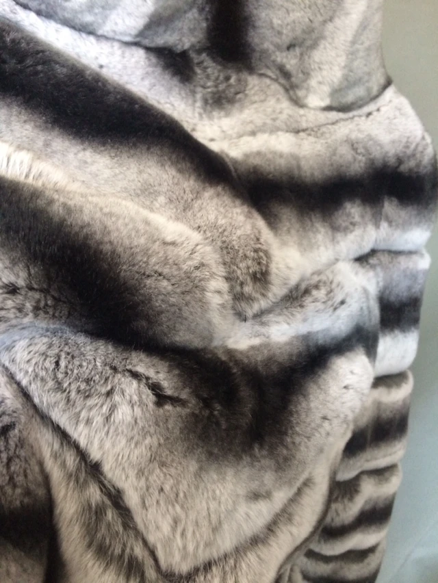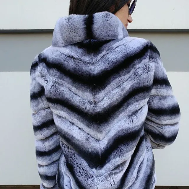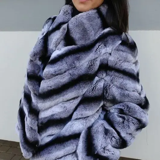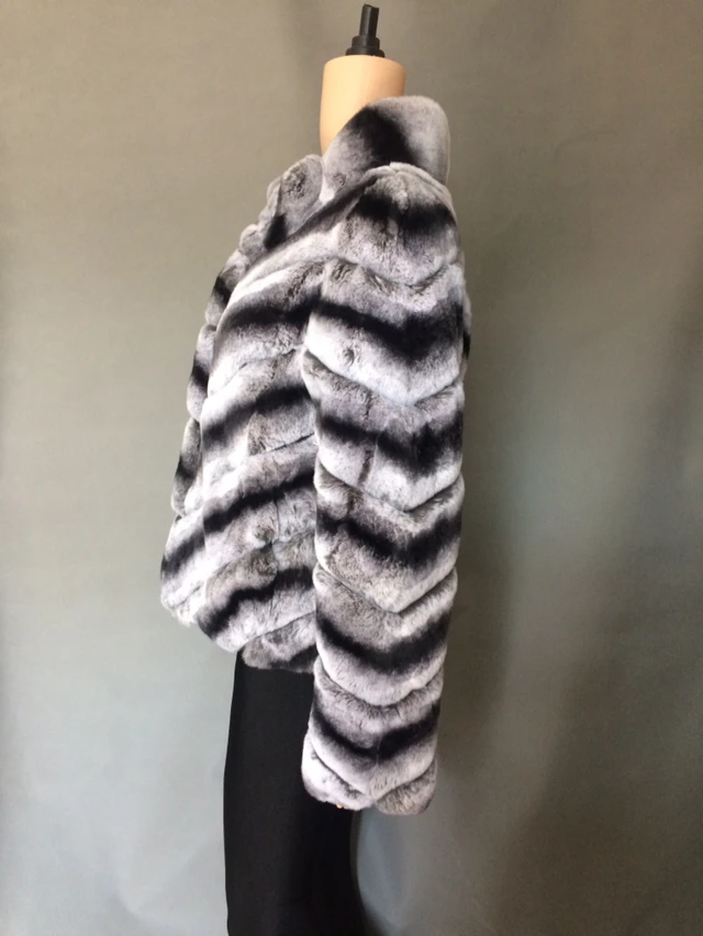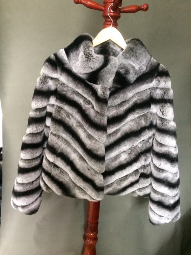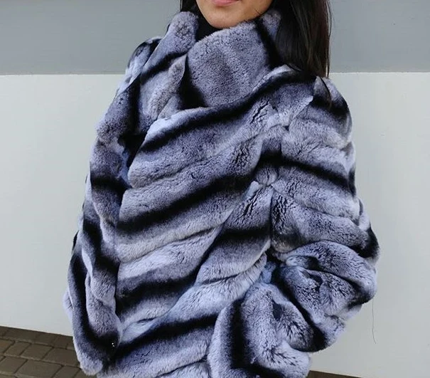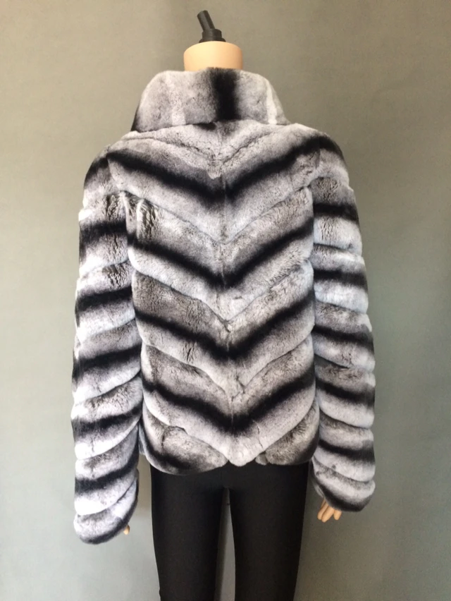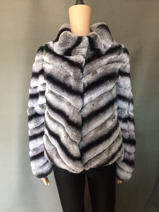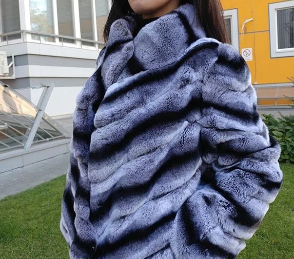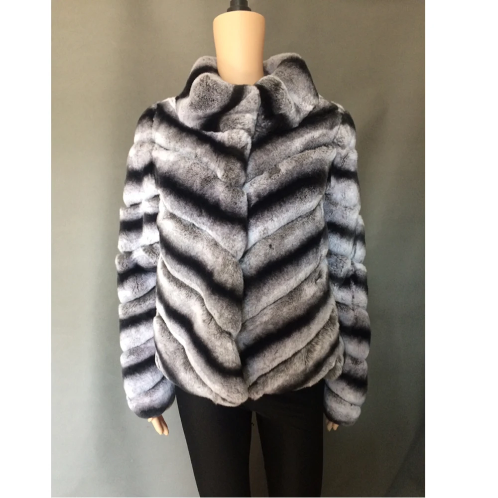 Куртка женская, короткая, зимняя, настоящий мех кролика, с полоской шиншиллы, теплая, Классическая, мягкая, пушистая, 2018