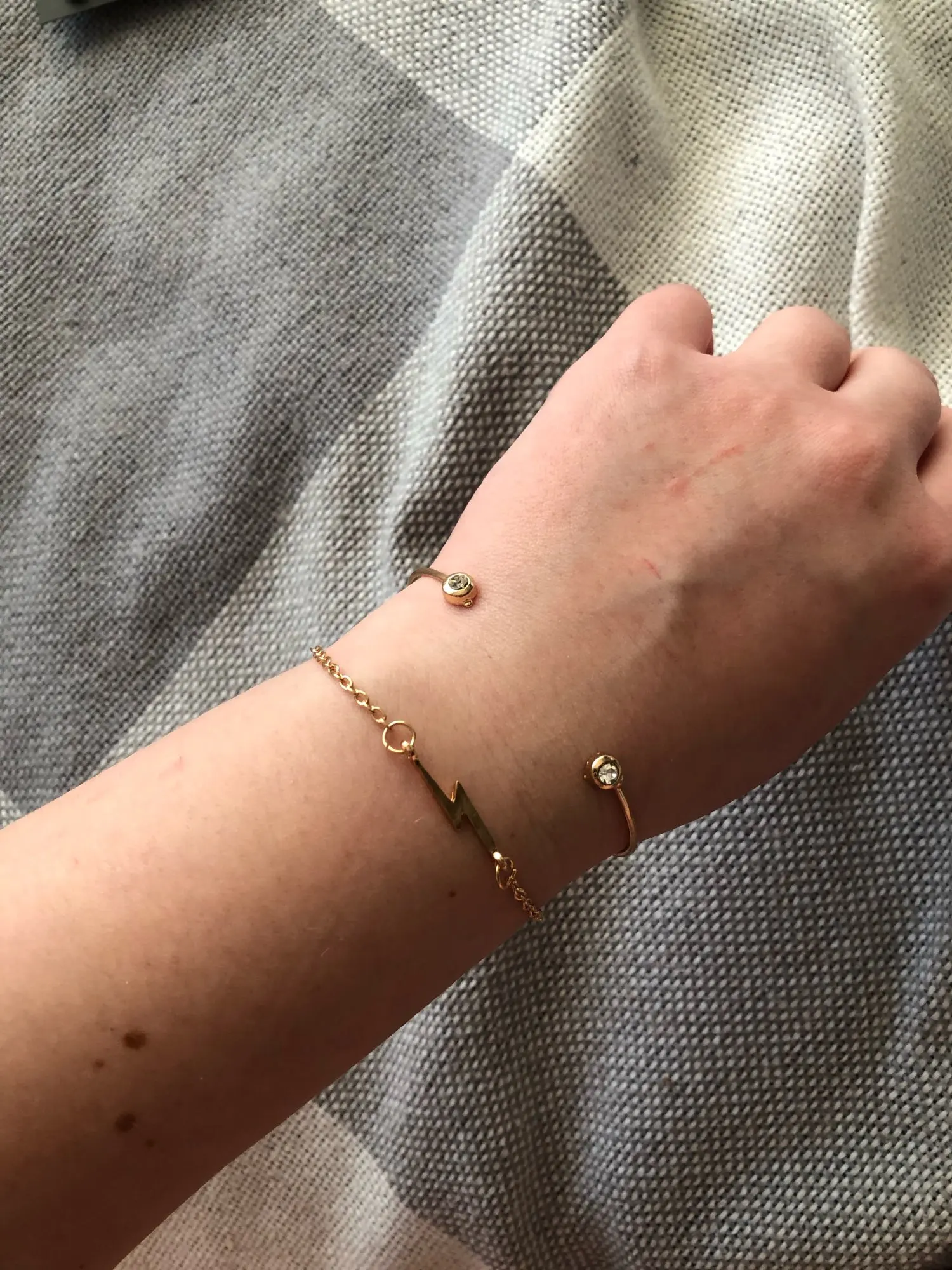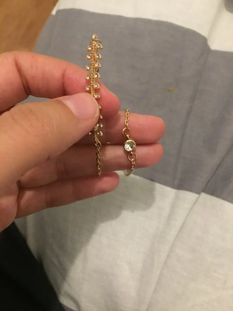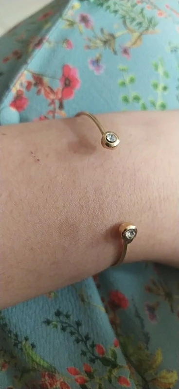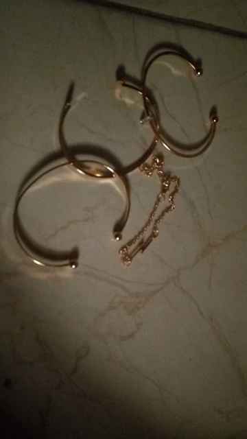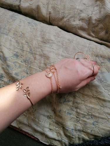 Браслеты симпатичные, но те, которые не на цепочке, а единым кольцом, пришли разного размера и даже разной формы, один был круглым, другой овальным, будто до этого его уже надевали. Затем, браслеты в принципе большие, мне оказались сильно велики, как их не сжимай и на минимальный размер не застегивай, они остаются свободными и очень легко перемещаются по руке. Такого статичного положения, как на картинке, если у вас небольшая рука - не будет. Прикладываю фото как это могло бы быть и как есть на самом деле, в реальности они скатываются в одну кучу и висят.