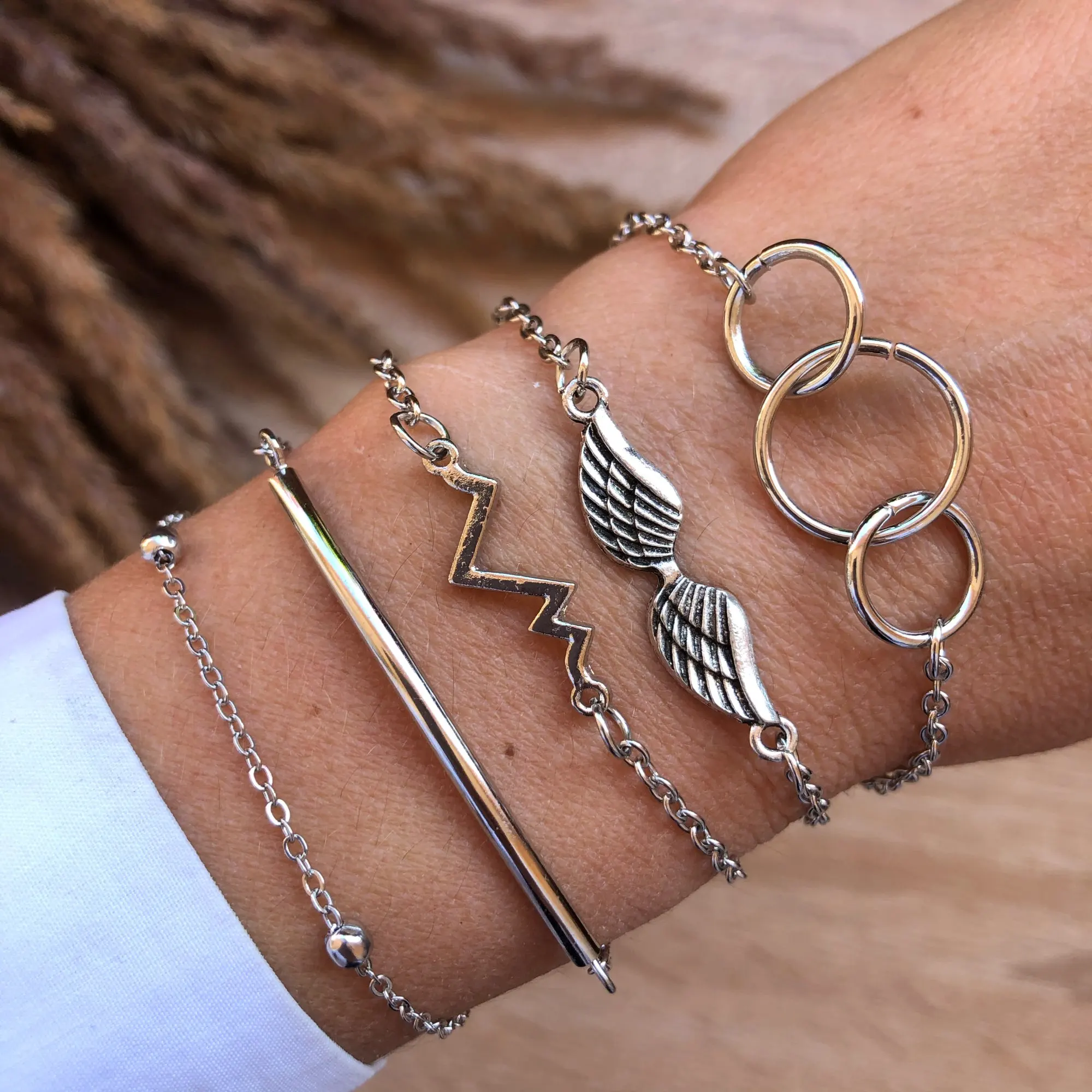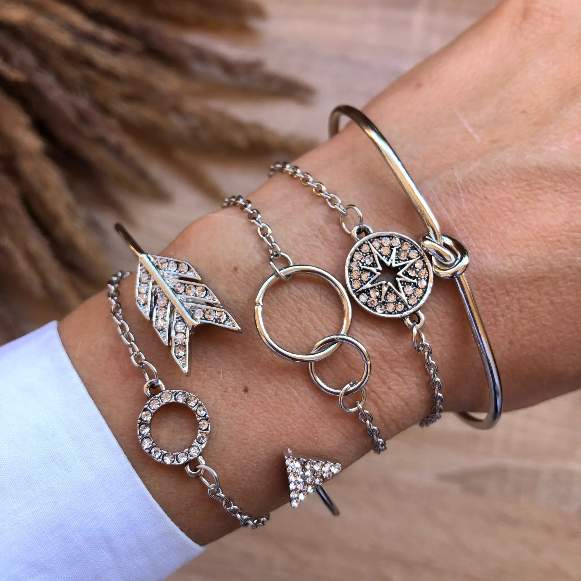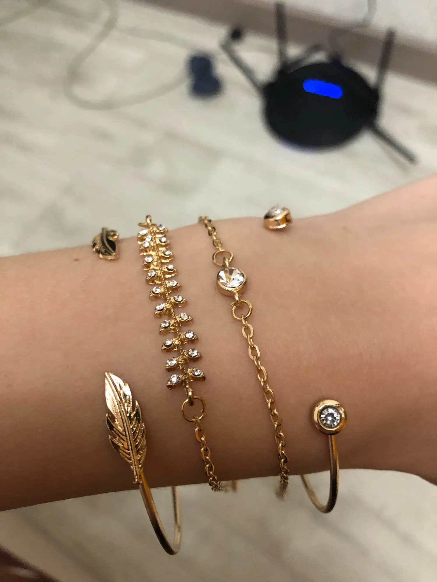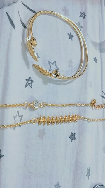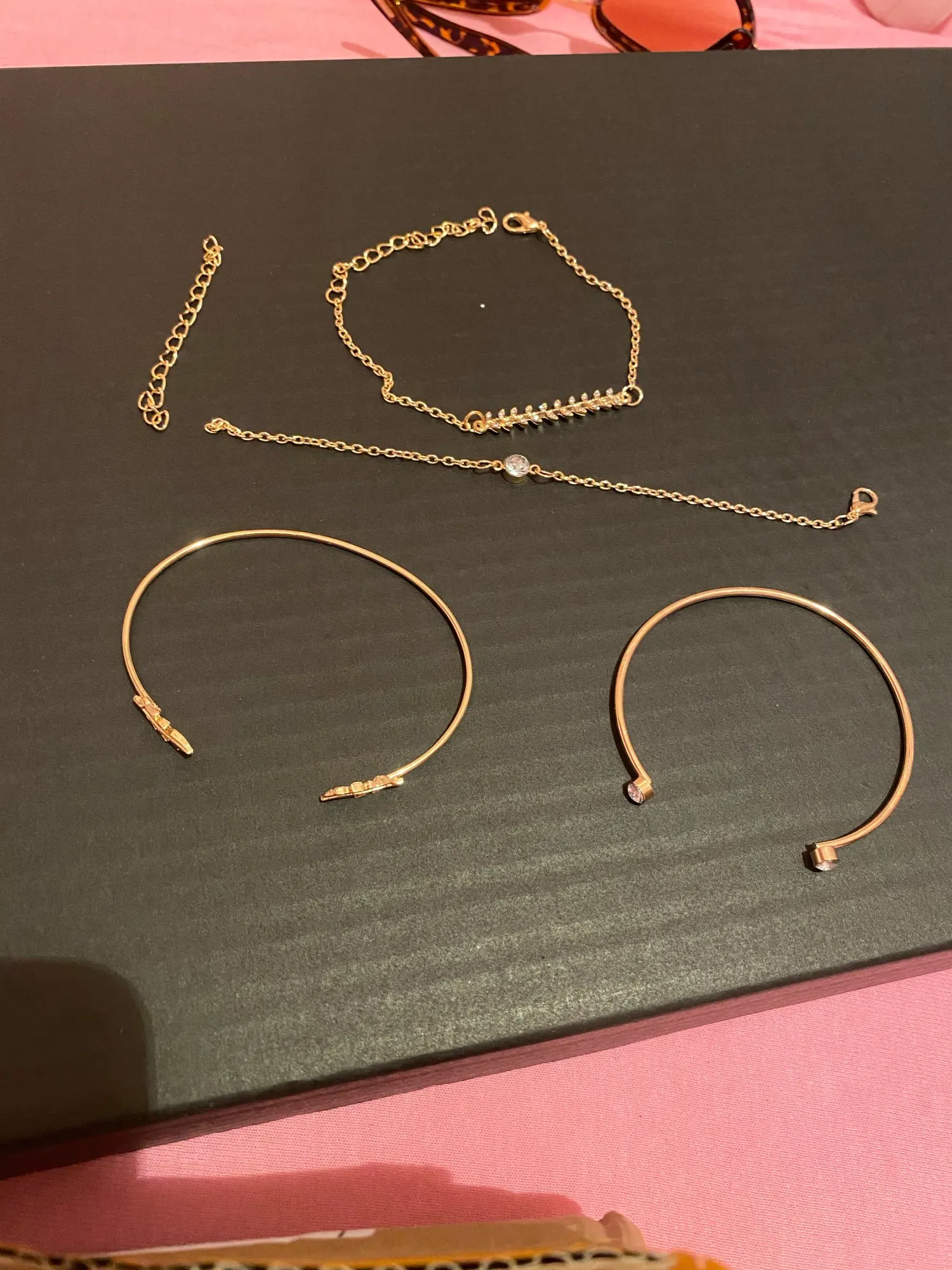 Пришел комплект из 5 браслетов, 2 жестких с лепестками и стрелой, и 3 на цепочке с разными украшениями. Доставили очень быстро.