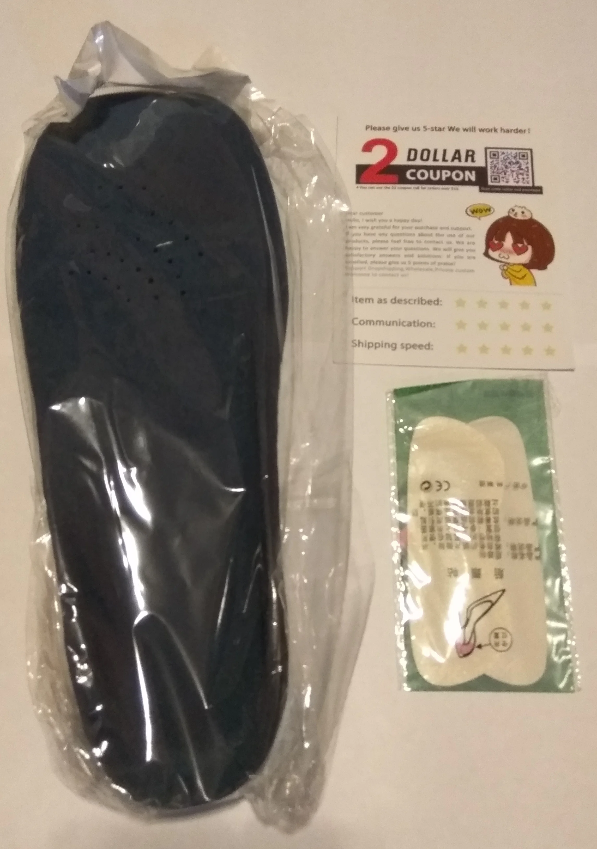 Заказ 08 октября, получение - 30 октября. Товар соответствует описанию, присутствует неприятный химический запах, думаю, должен выветриться. Кроме стелек, продавец положил купон на 2 долл. на следующую покупку и наклейки на обувь от натирания.