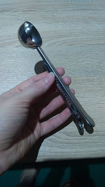 Довольно удобная вещица. Вроде ничего необычного, но облегчает жизнь. Доехала до Коми ровно за месяц. Зажим тугой и прочный, держит упаковку плотно. Ложка довольно глубокая и вместительная, диаметром больше 3 см, набирать кофе из пакетов или чай очень удобно. Продавцу респект!