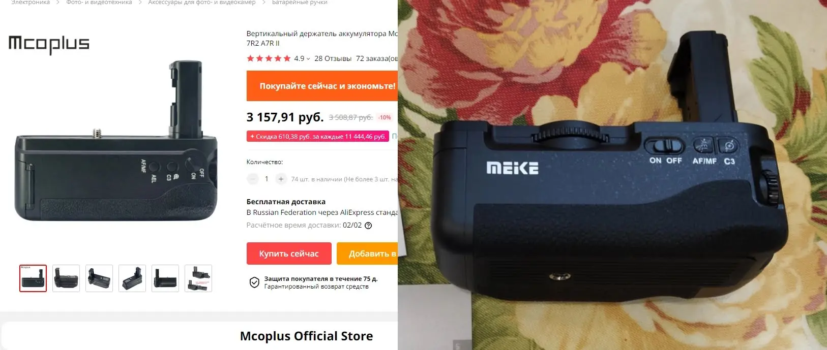 В отзывах к товару, есть отзывы в которых прикреплены фото с совершенно другой рукоятью фирмы meike, плюс одной из фотографий самого товара является та же самая рукоять meike. Что вводит покупателя в смятение и непонимание какая рукоять ему придет. Я например к своему несчастью ориентировался на отзывы с фото и мне пришла другая. Пришедшая мне рукоять менее эргономична и удобна, плюс стилистически больше подходит к первому поколению камер a7.